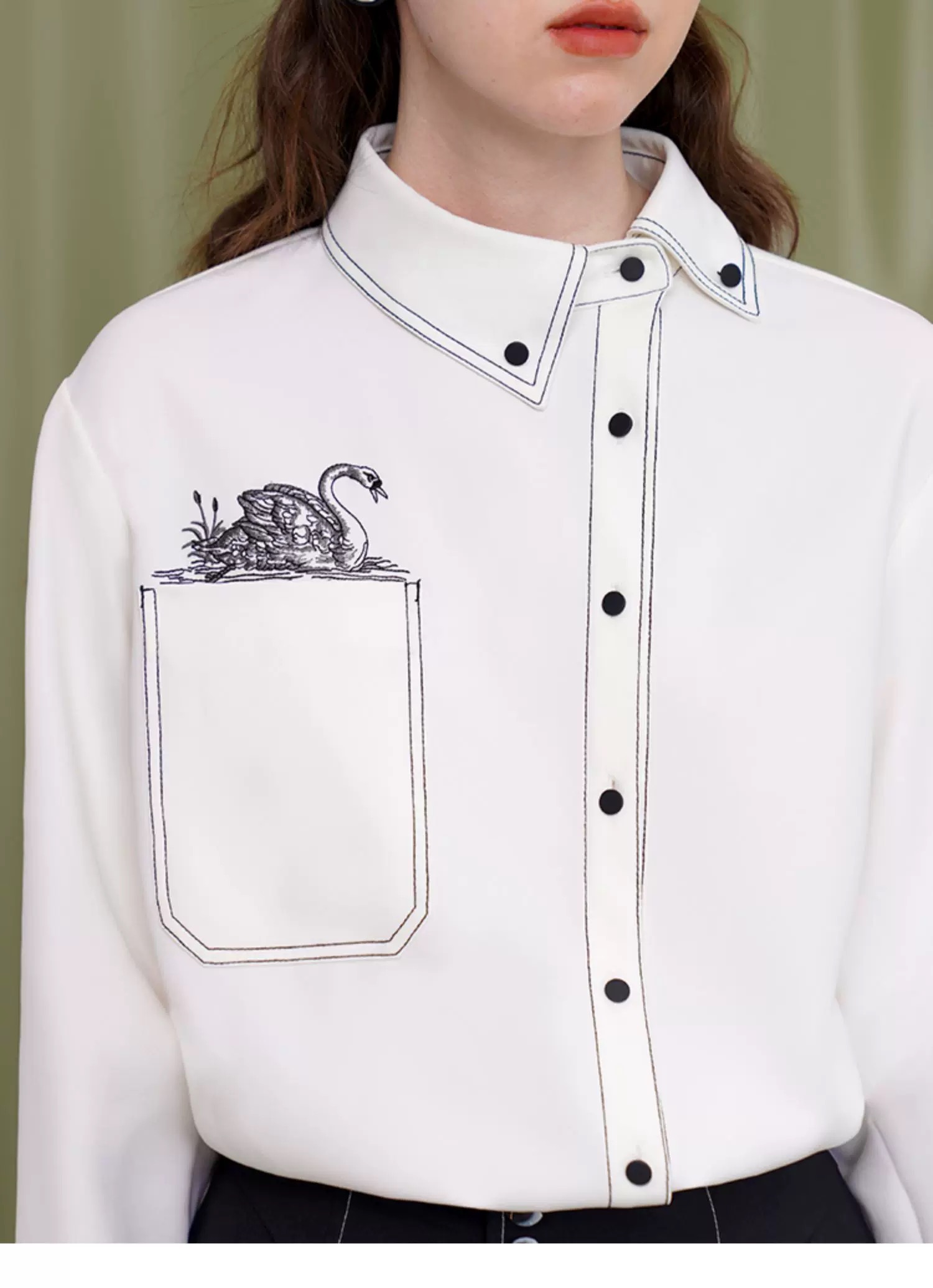 モード系オフィスカジュアルに最適なスワン刺繍シャツ