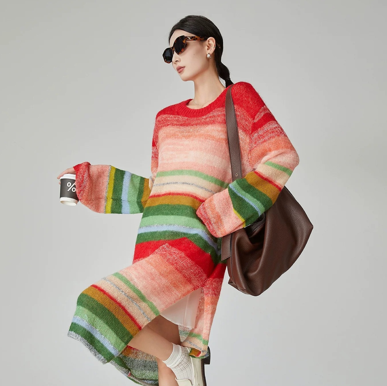 ボーダーニットワンピースなど、カラフルなレディースファッションとの組み合わせで、明るく個性的な印象を演出します。
