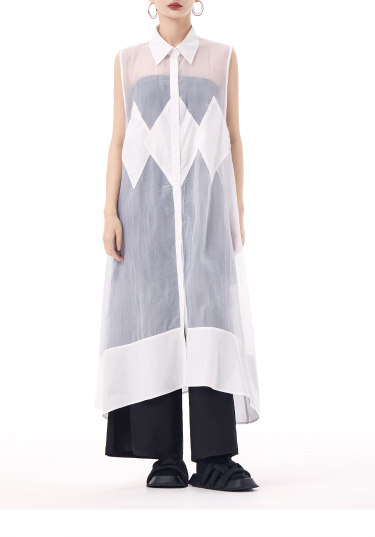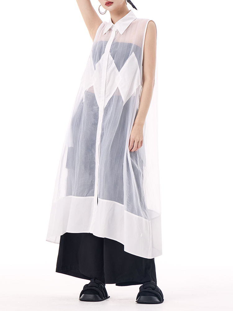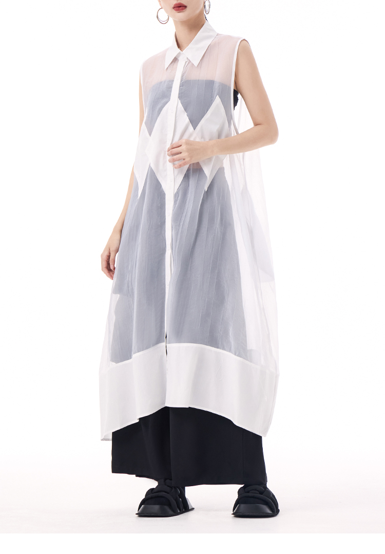 軽やかなシアー素材をベースに、幾何学的な切り替えを効かせたロングシャツワンピースです。