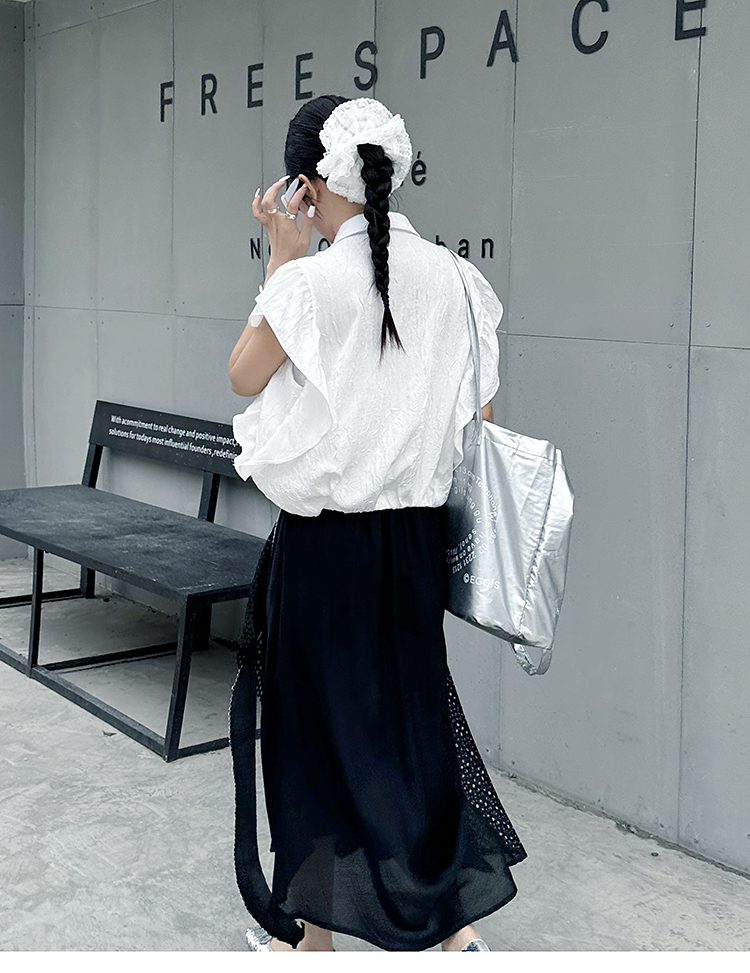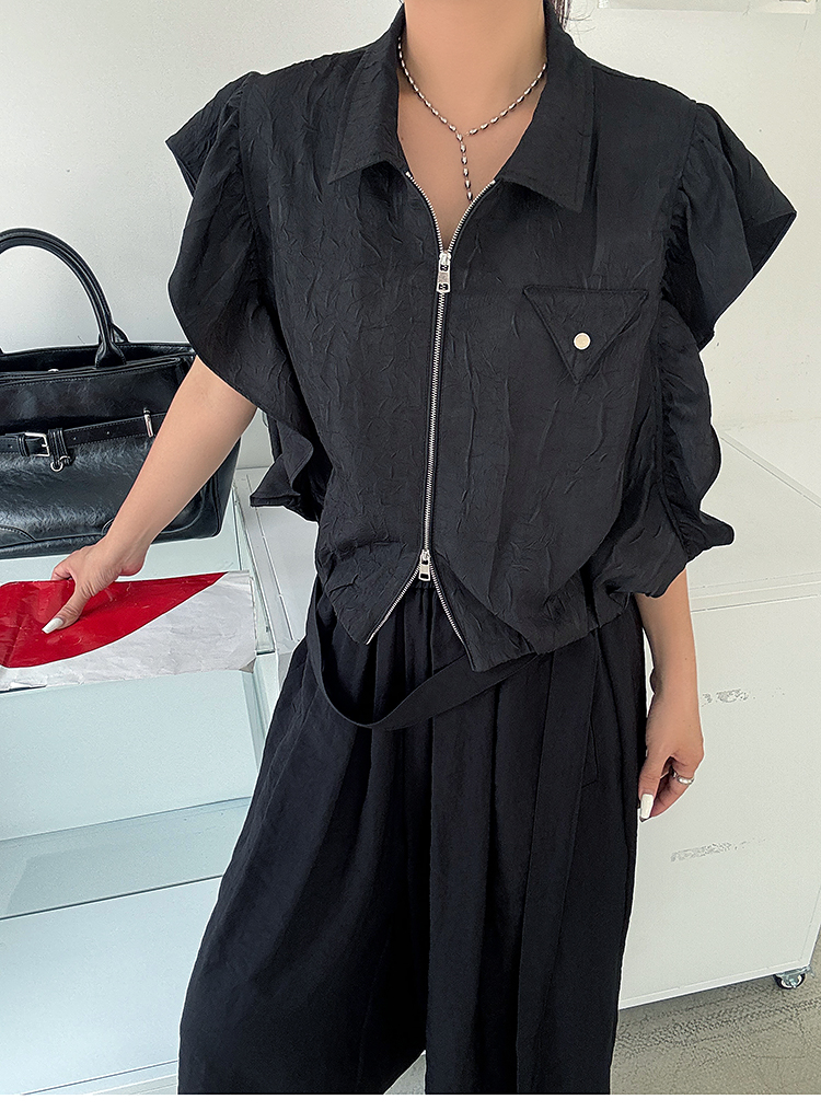 存在感のあるフリル袖とフロントジップが特徴のショート丈ブラウス。シワ感のある軽量素材が立体感を生み出し、夏らしい抜け感とクールな印象を両立。シンプルなのに印象的な、都会的モードスタイルにぴったりの一枚です。