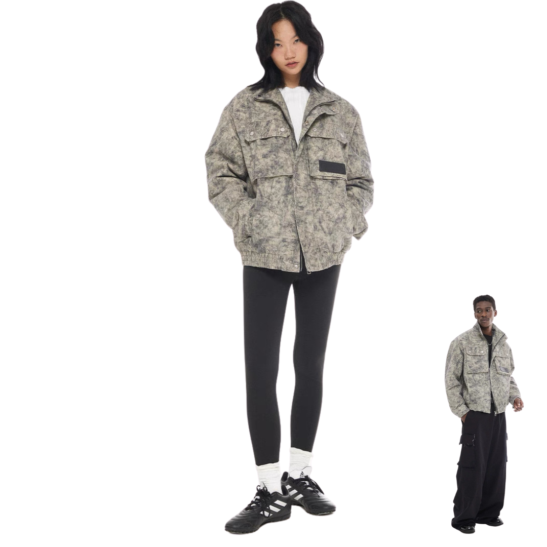 胸元の複数ポケットがアクセントとなり、実用性と個性的なスタイルを両立