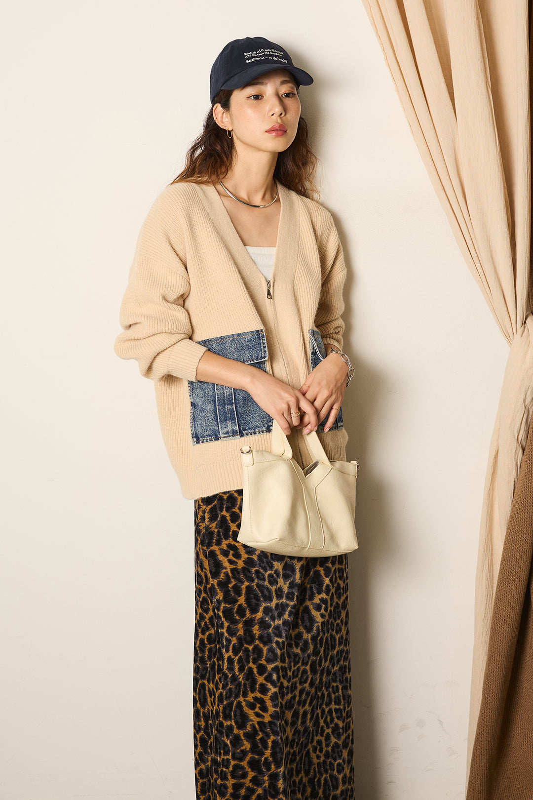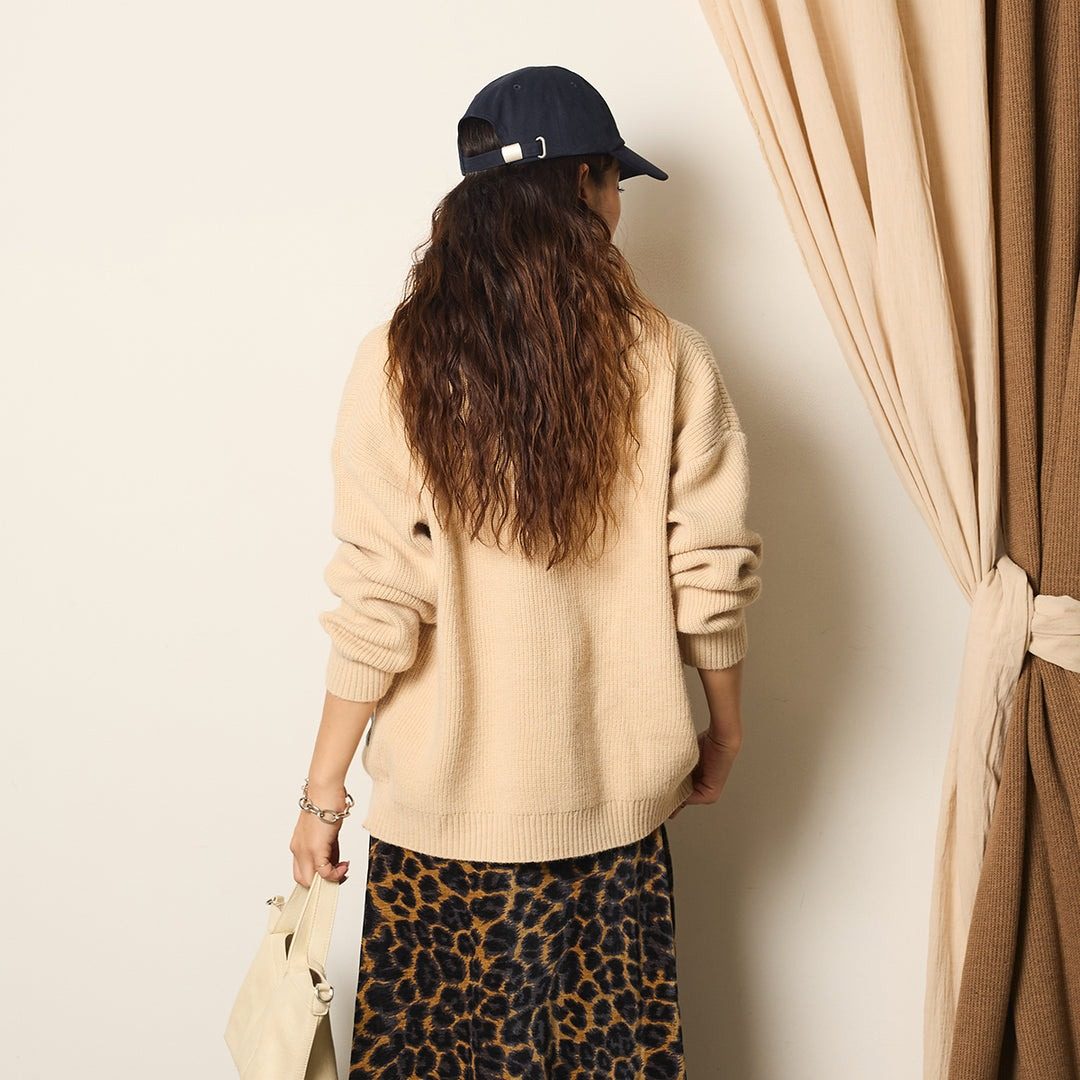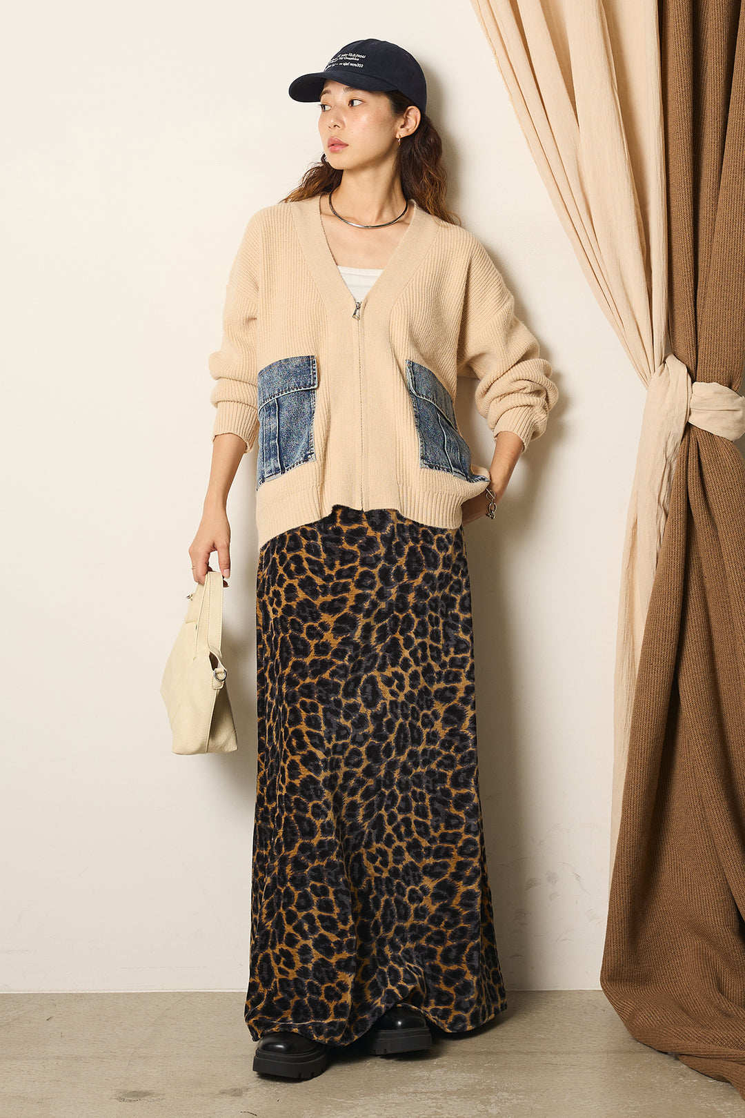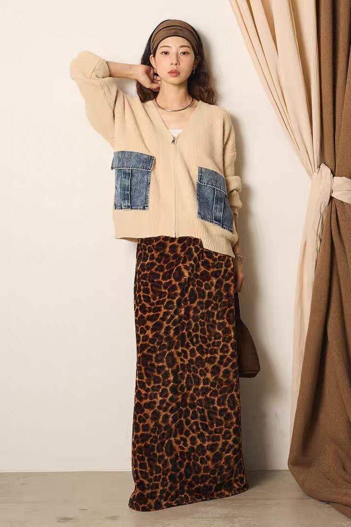 インナー次第でロングシーズン活躍し、レオパード柄や無地ボトムなど、幅広いスタイリングに馴染みます。