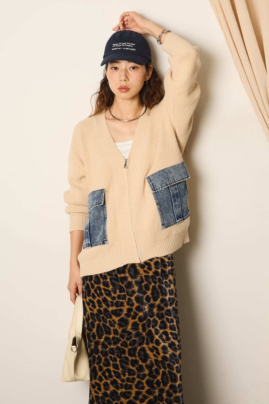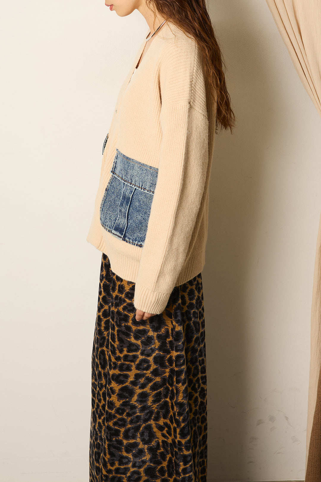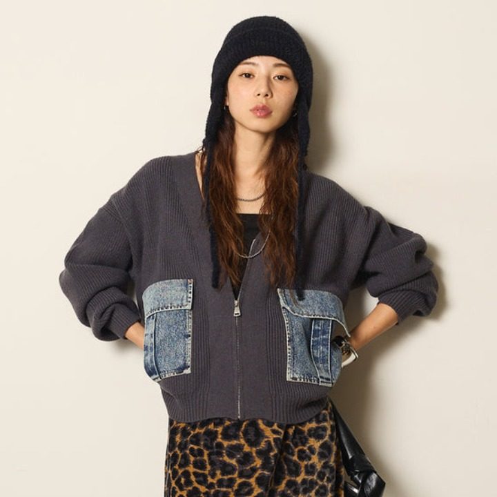 胸元のデニムポケットがカジュアルでおしゃれな印象を演出し、普通のカーディガンとは一味違う個性を表現