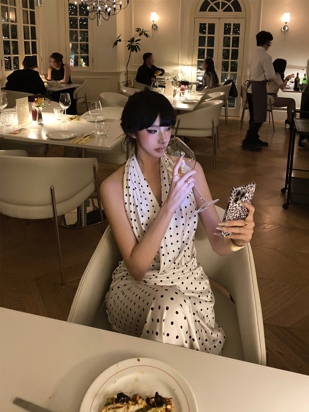 洗練された白地に黒のドット柄が映えるマキシ丈ドレス。ホルターネックデザインと背中の大胆な開きが魅力的。都会的な雰囲気と女性らしさを兼ね備えた一枚で、パーティーやフォーマルな場面に最適です。ゴールドのアクセサリーと合わせて、よりラグジュアリーな印象に。