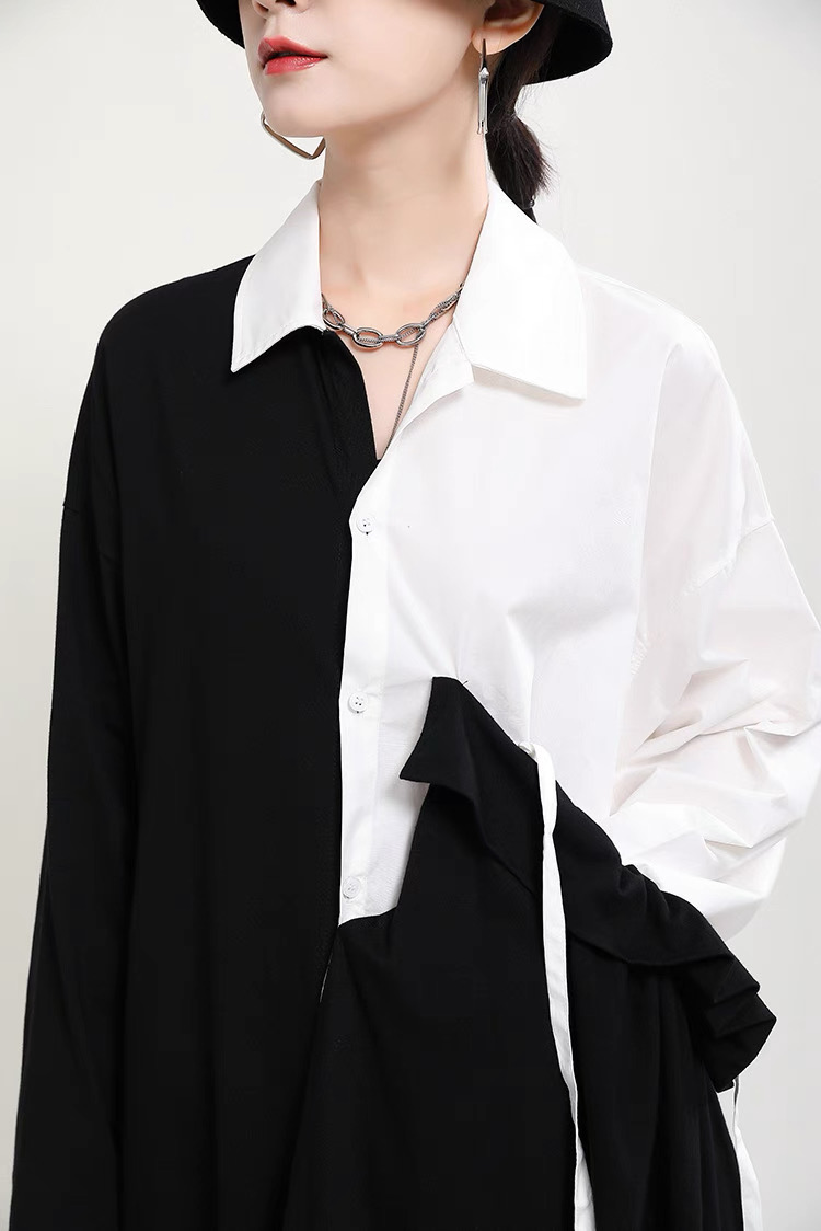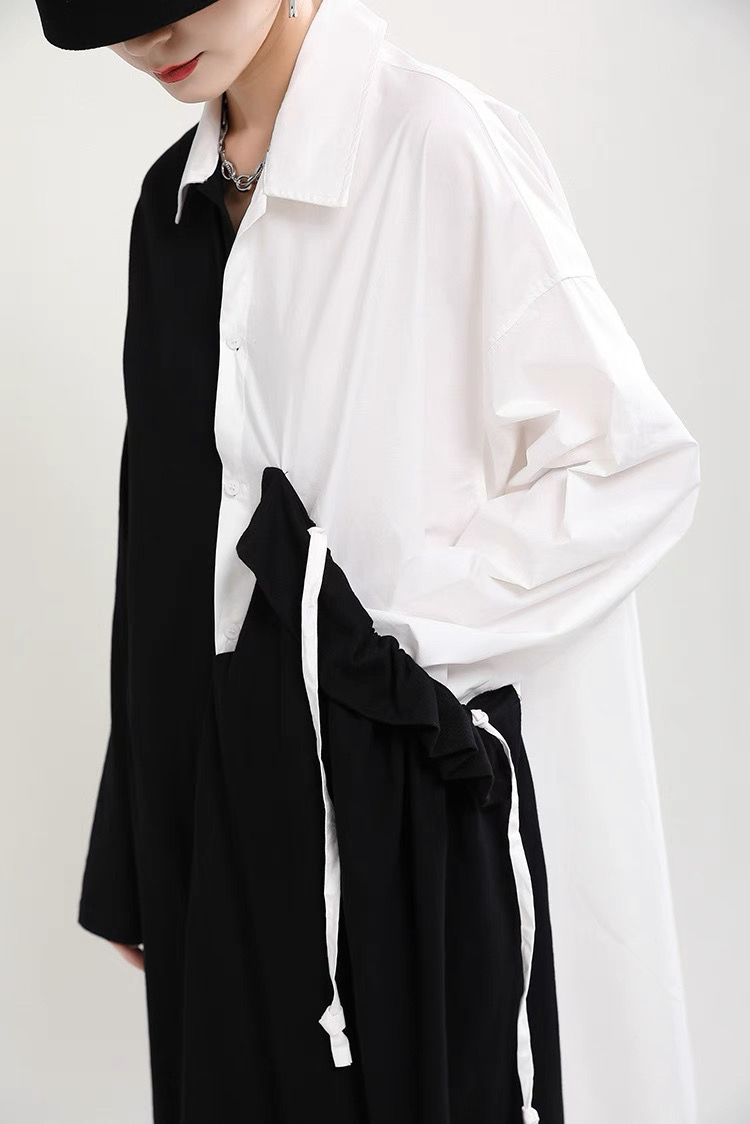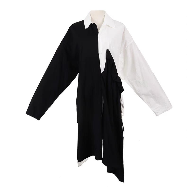 大胆なバイカラーデザインとアシンメトリーなシルエットが視線を惹きつける、唯一無二のモード系シャツワンピース。ホワイトとブラックのコントラストが印象的で、シンプルながらも個性を際立たせる一枚です。