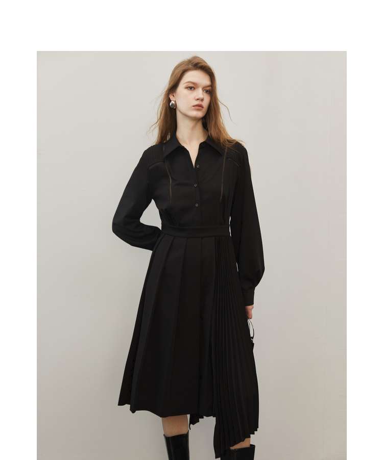 洗練されたエレガンスを体現するシャツワンピース。胸元から裾にかけて施された縦ラインのプリーツ切替えが、モード感を引き立てるデザイン。長袖と襟付きのスタイルが上品さを演出し、ウエストマークによるシルエットの美しさが際立つ。デイリーから特別なシーンまで、幅広く活躍する一着。あなたのワードローブに欠かせない存在となるだろう。