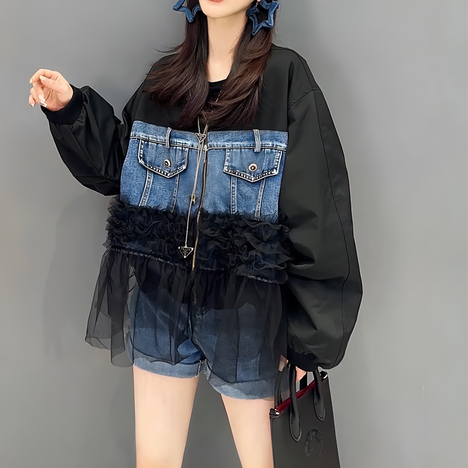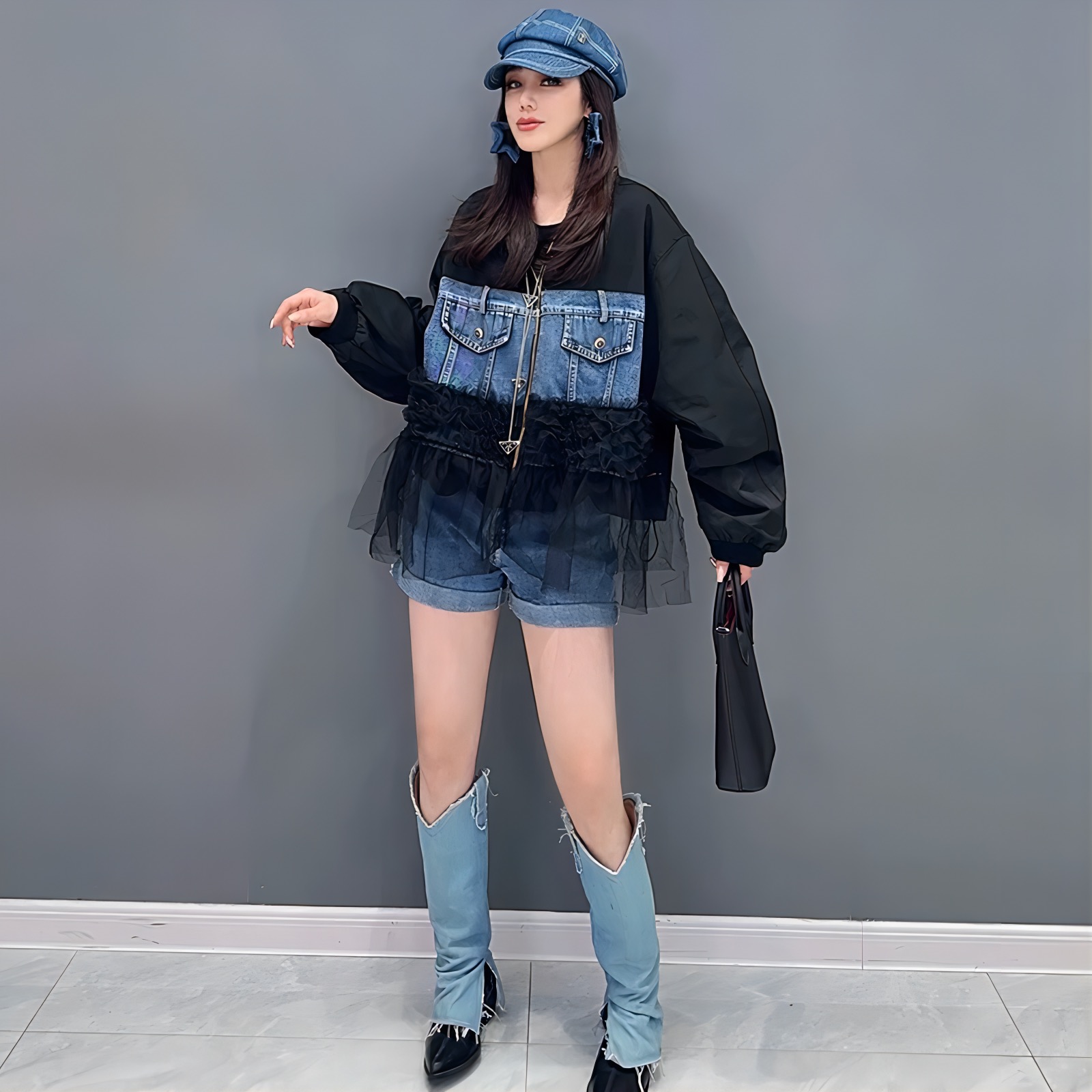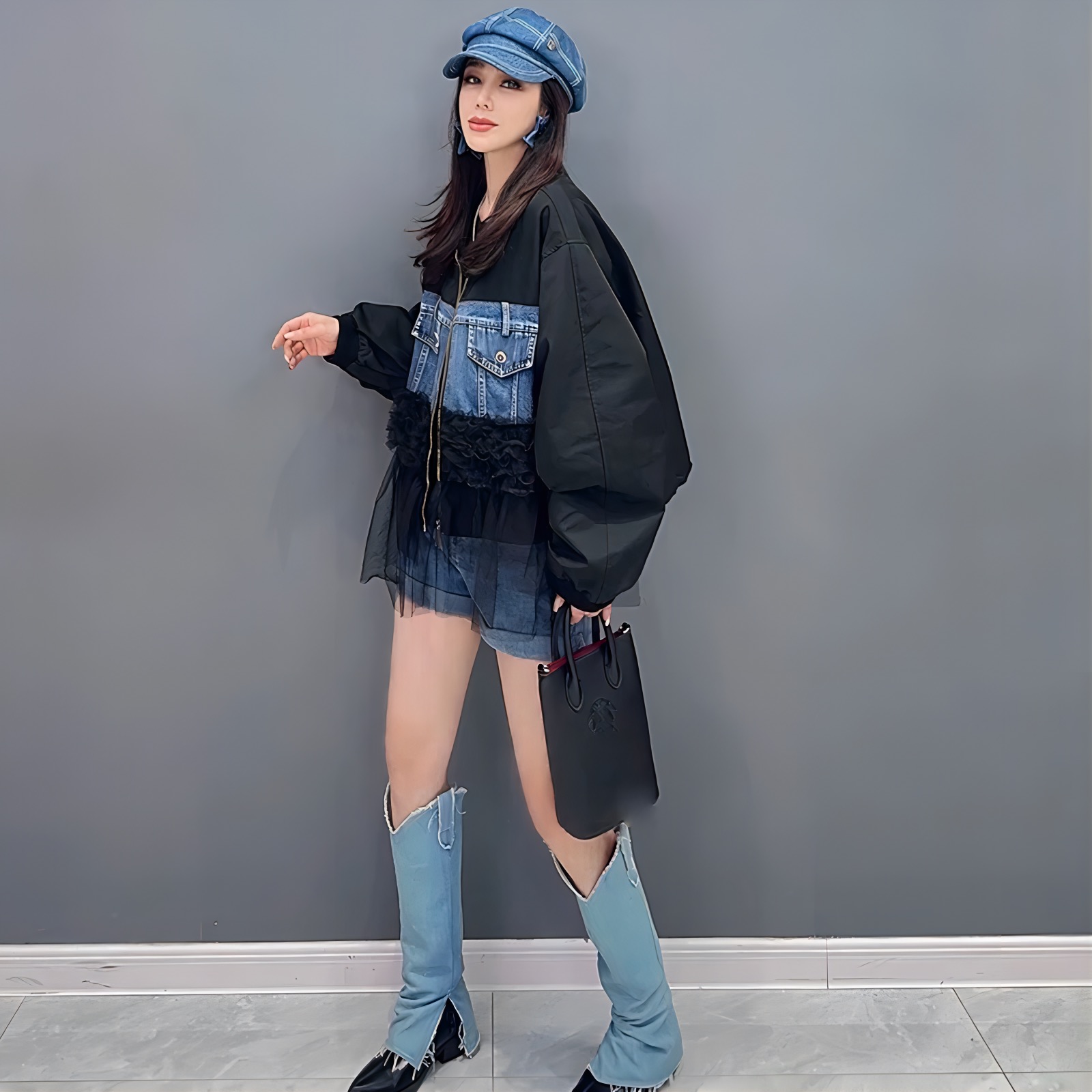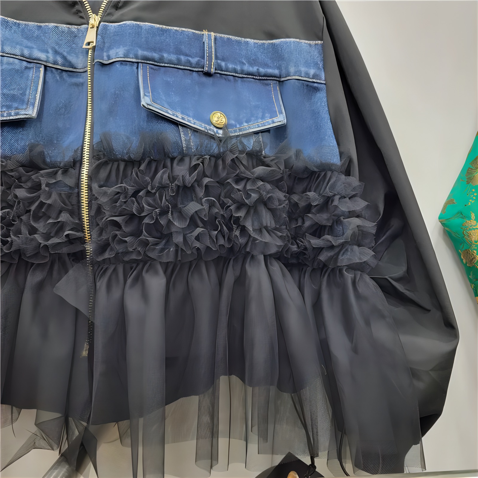 デニムとチュールを組み合わせた意外性のある構成で、カジュアルな中にも遊び心のある印象を演出