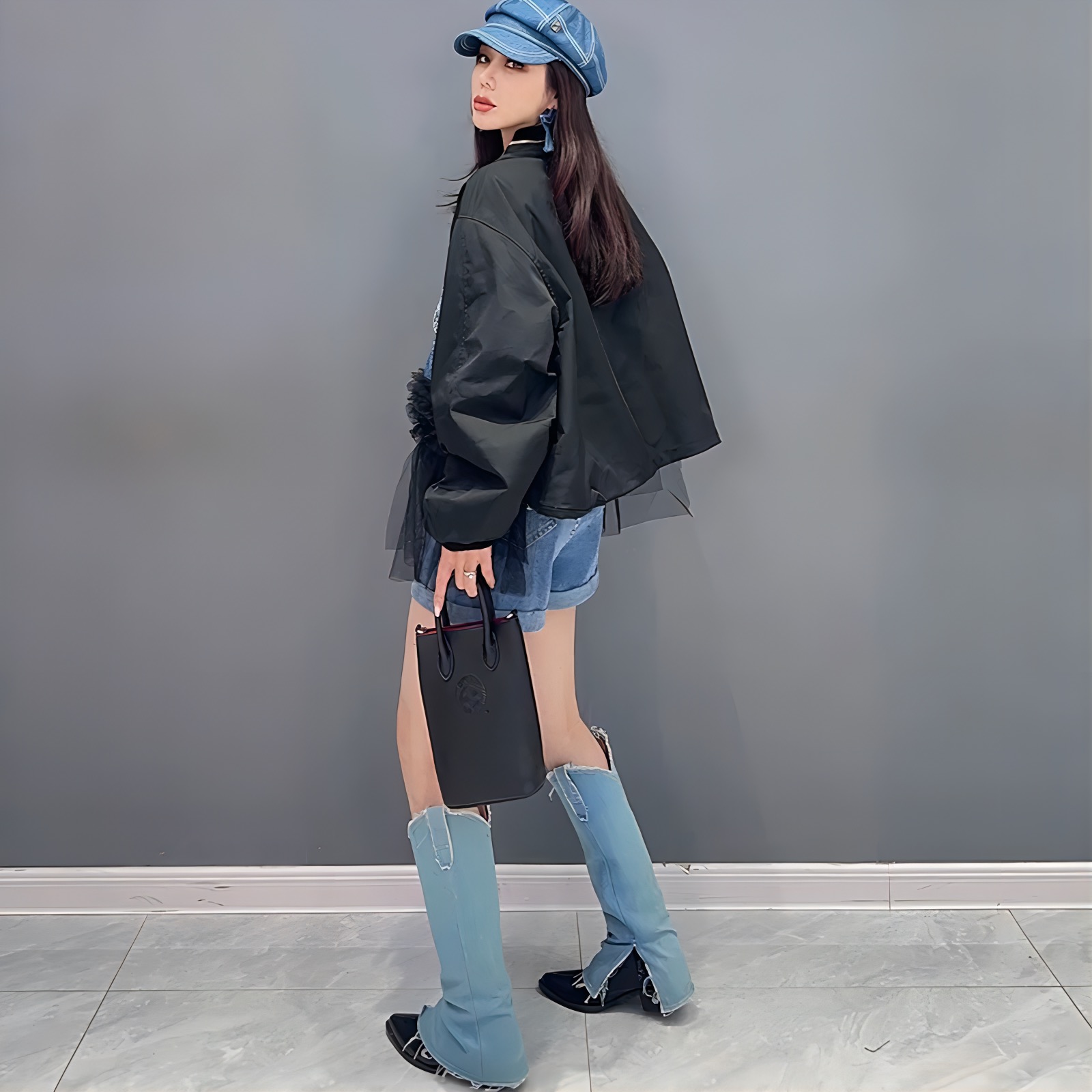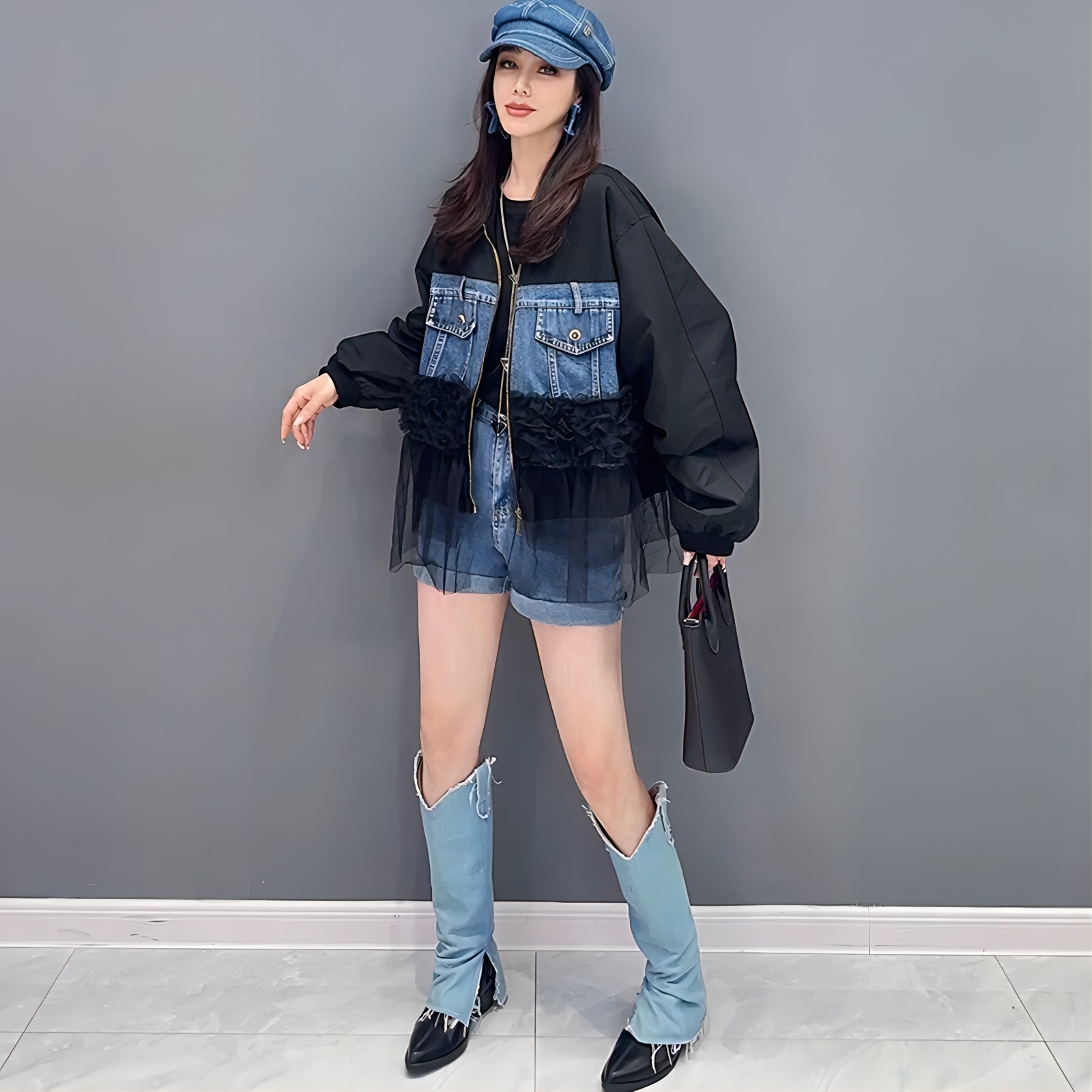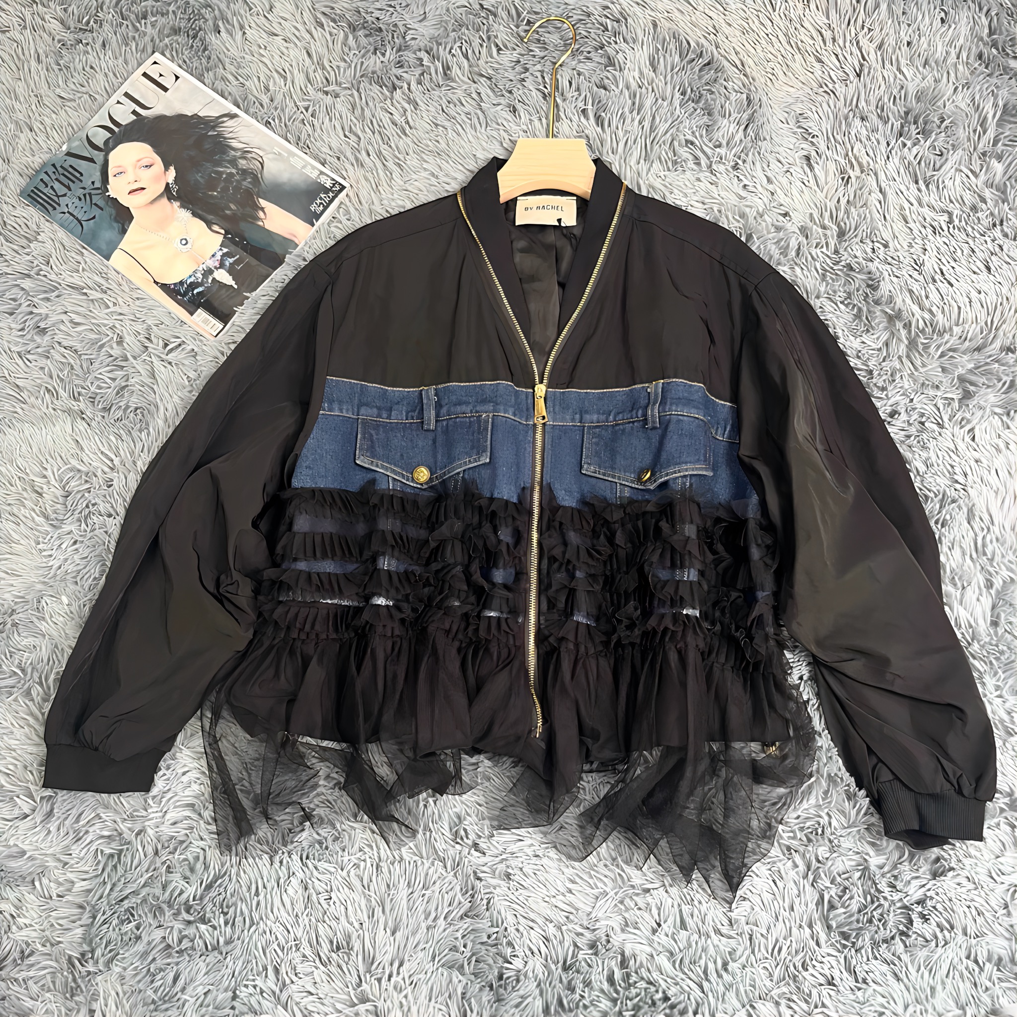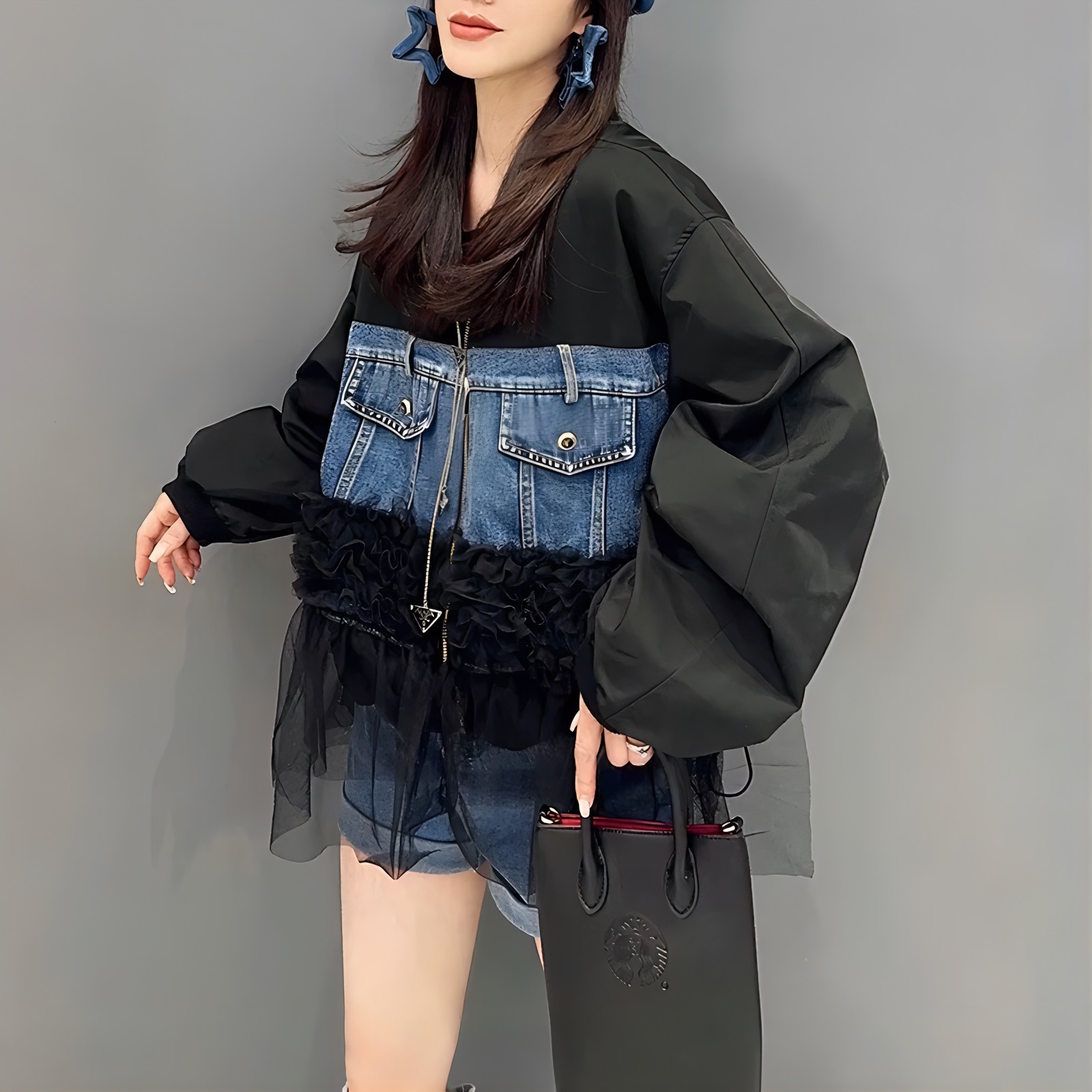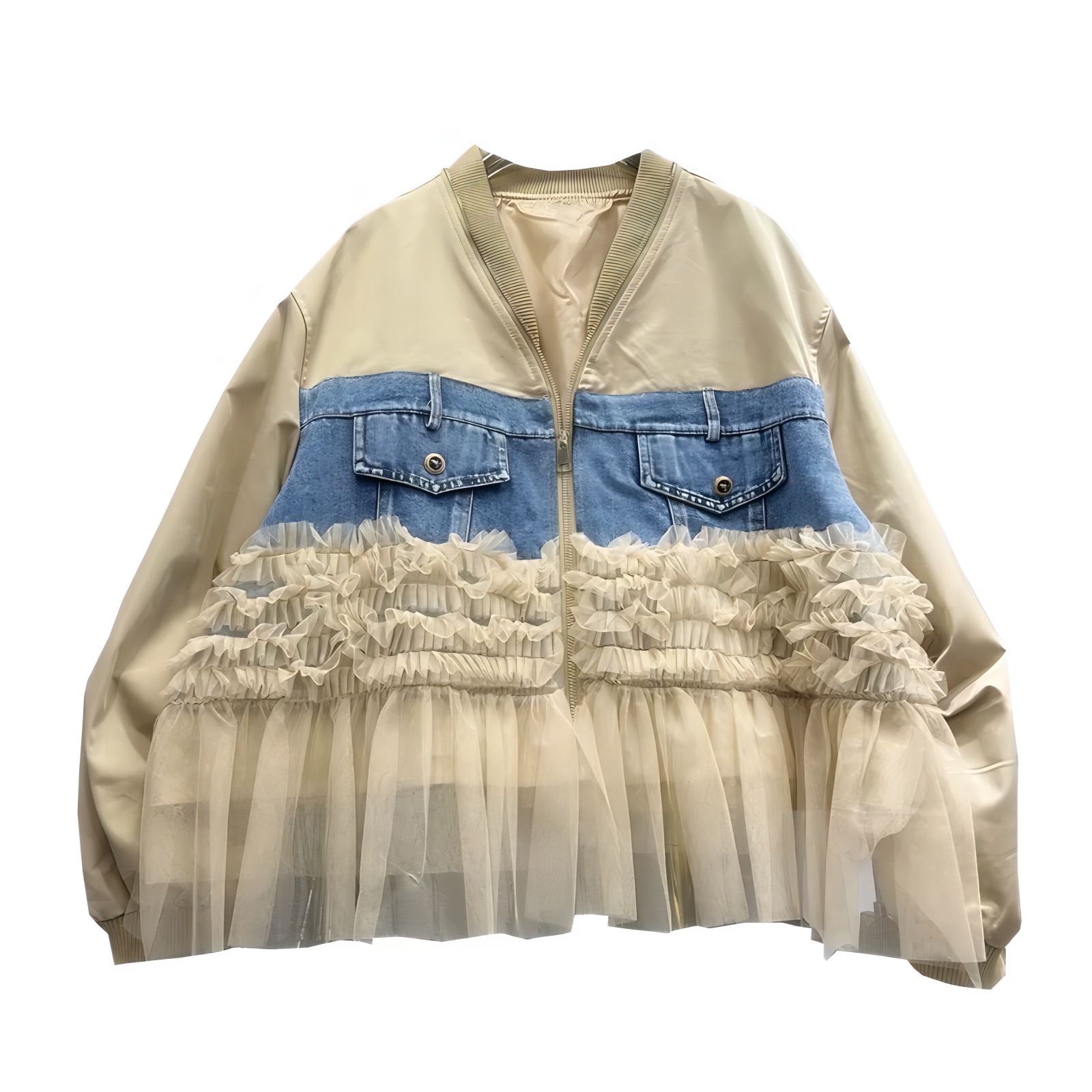 デニムとチュールを組み合わせた意外性のある構成で、カジュアルな中にも遊び心のある印象を演出