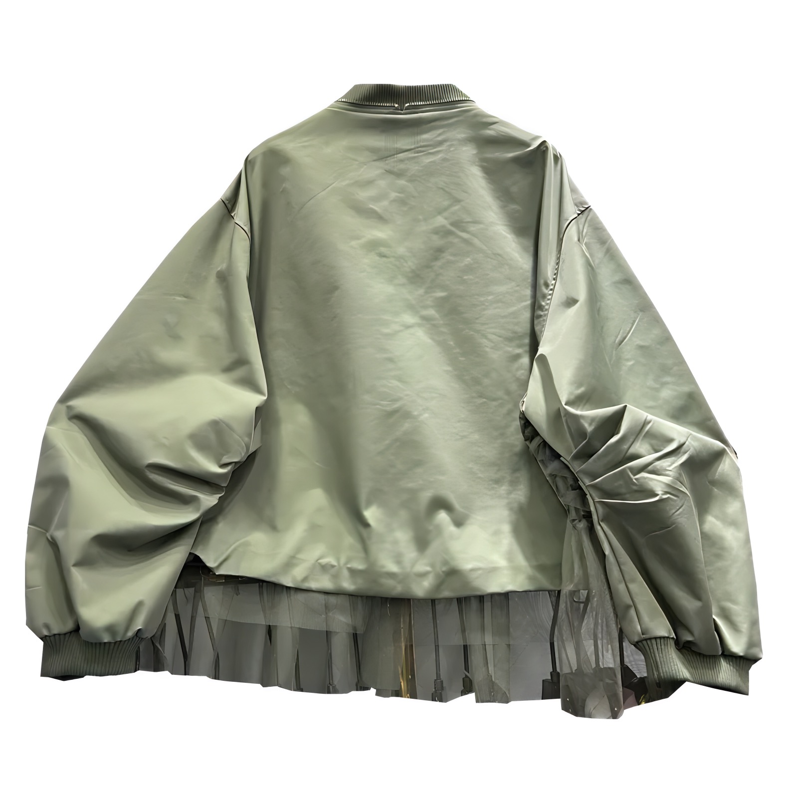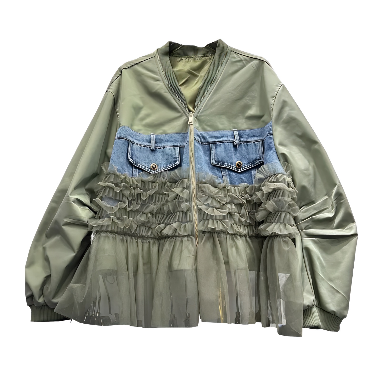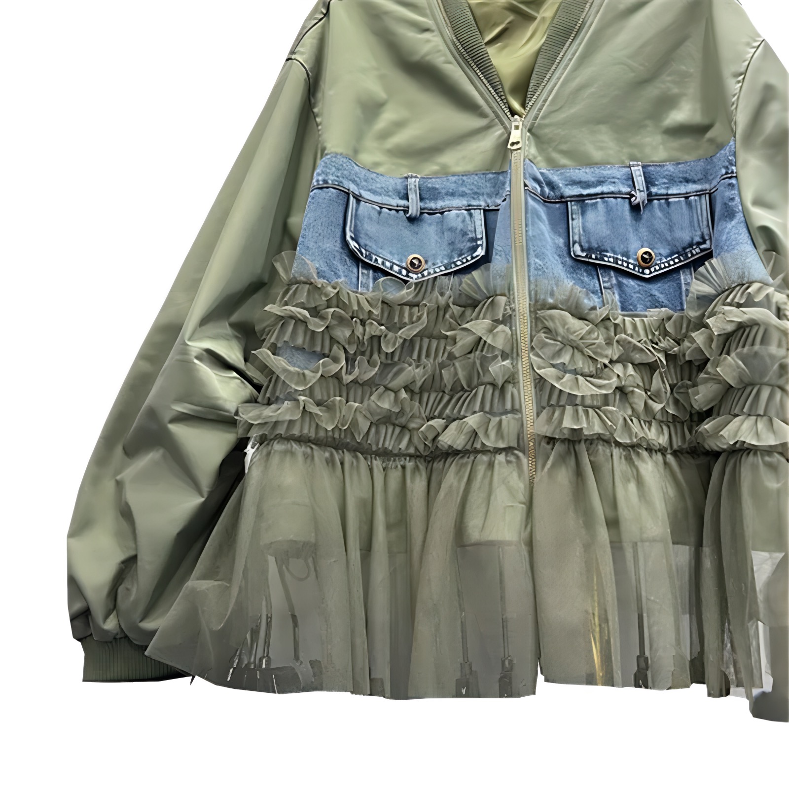ブルゾンタイプの実用的なデザインでありながら、フリルやデニムポケットでガーリーさをプラス