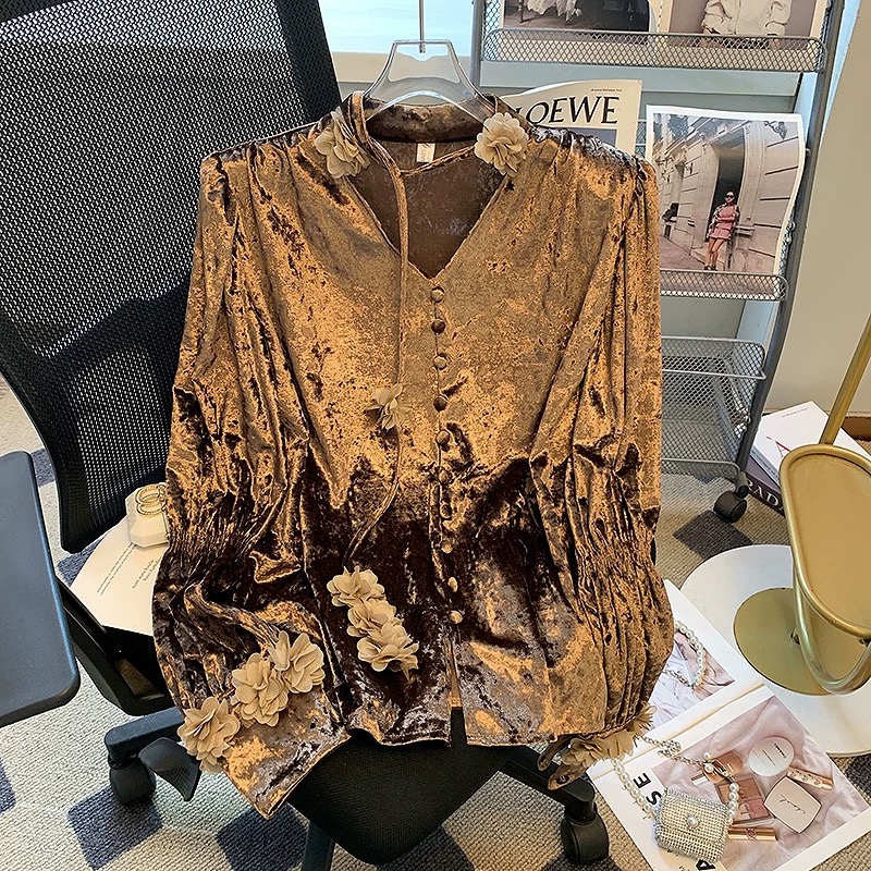 高級感のあるベルベット生地に、繊細な花装飾を施したブラウス。袖口や首元に立体的な花があしらわれ、フェミニンさとクラシックな印象を兼ね備えています。落ち着いた色味と美しい光沢感が大人の女性にぴったりです。