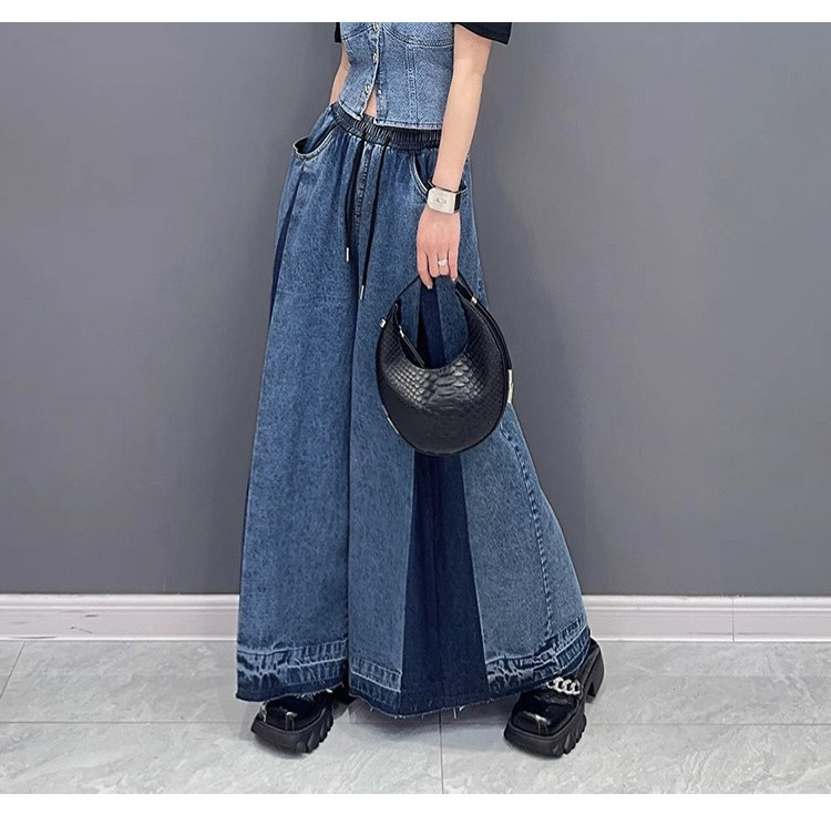 トレンドのワイドシルエットを取り入れた、スカートとパンツの要素が融合したデニム風スカート。