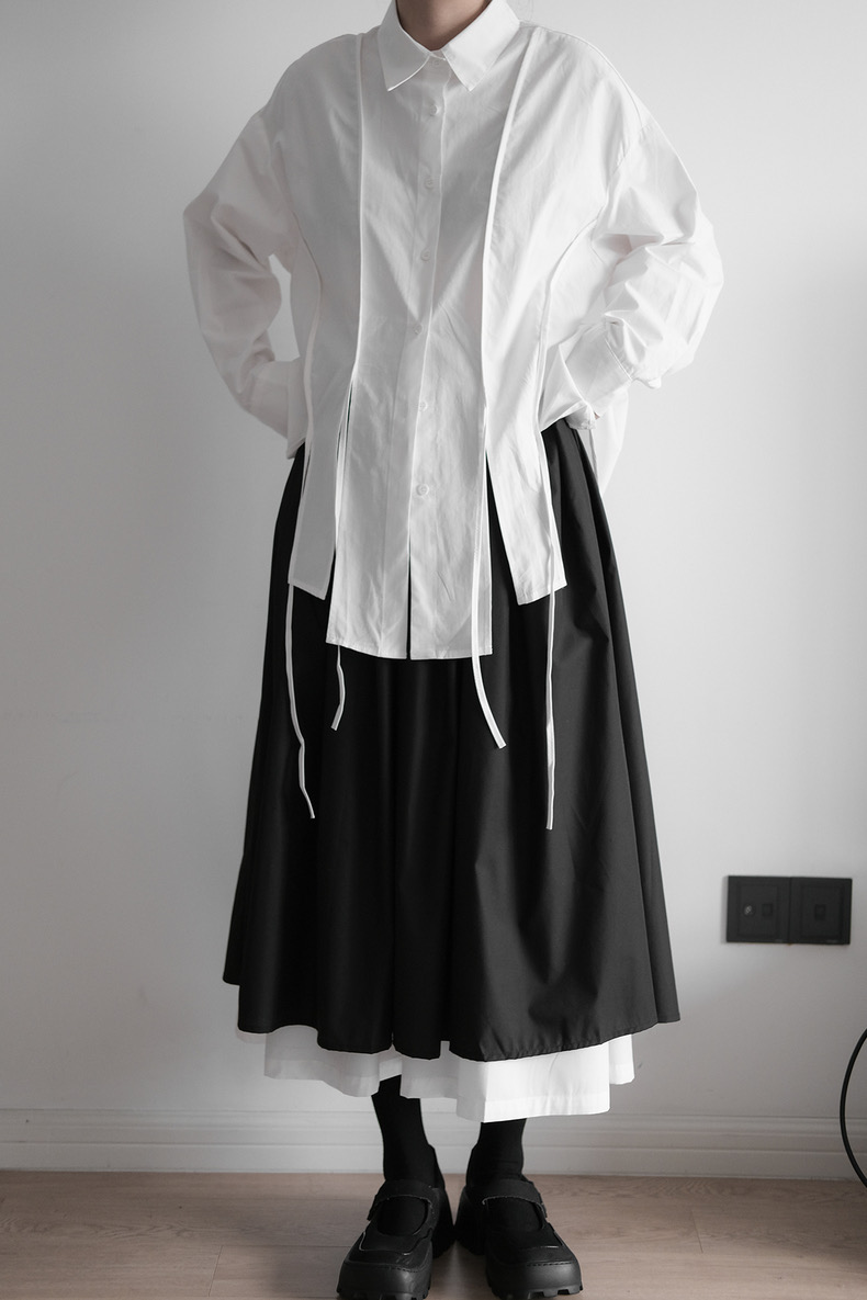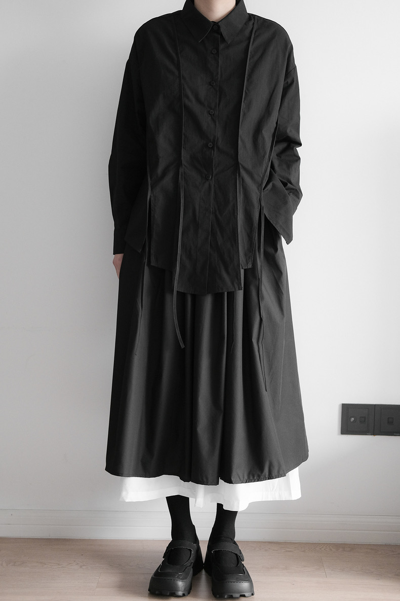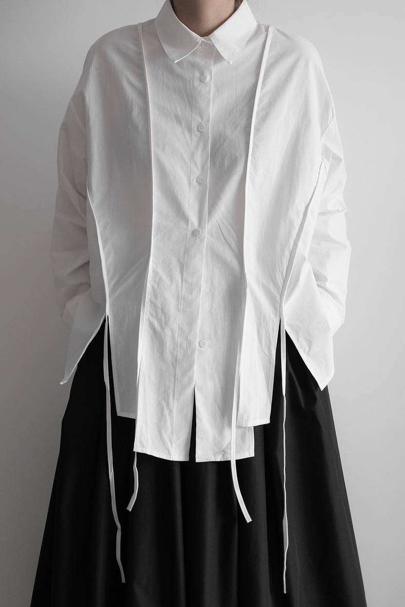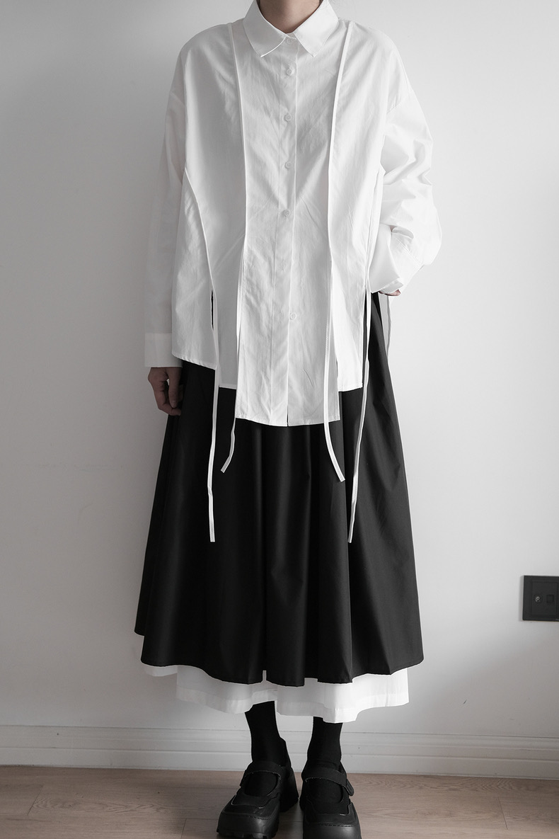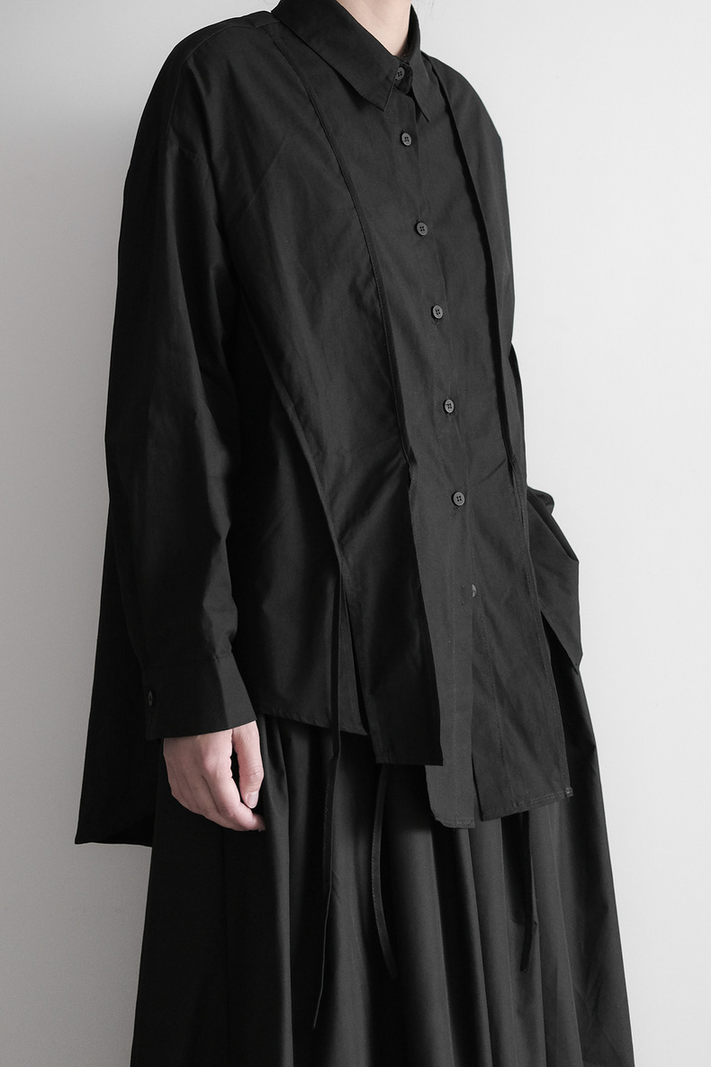 計算されたオーバーサイズと両サイドの大胆なスリット。潔く直線的なラインと、風に揺れるリボンディテールが共存する、モードな雰囲気漂う一枚です。