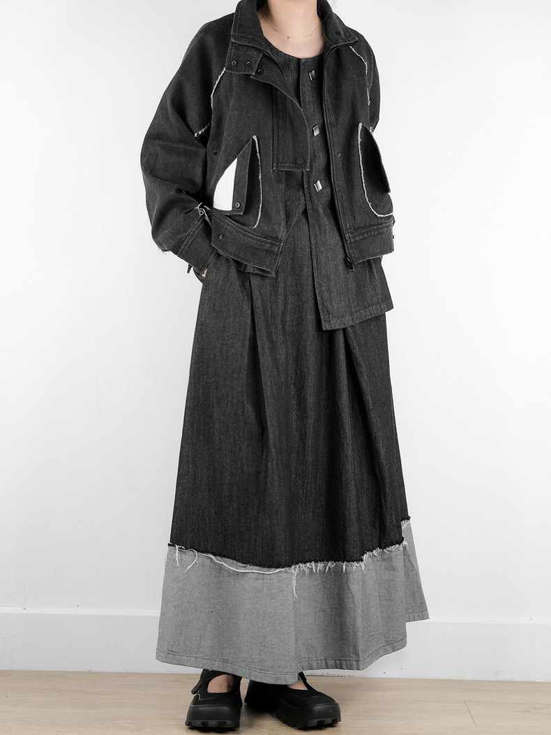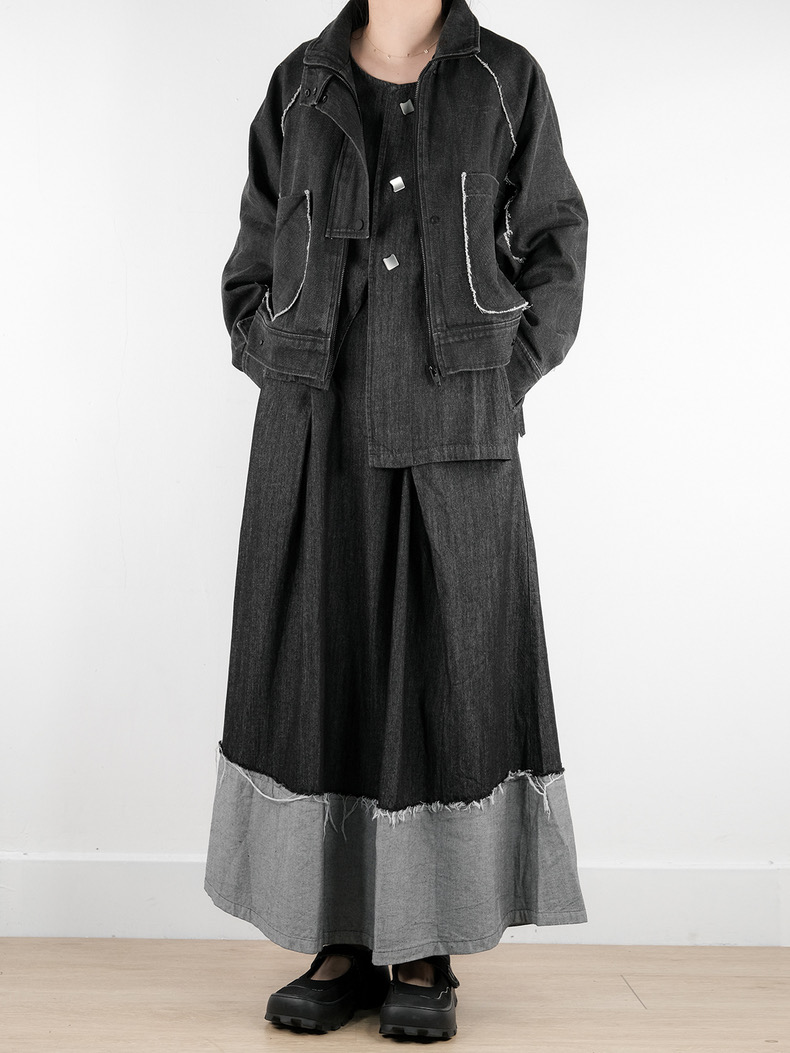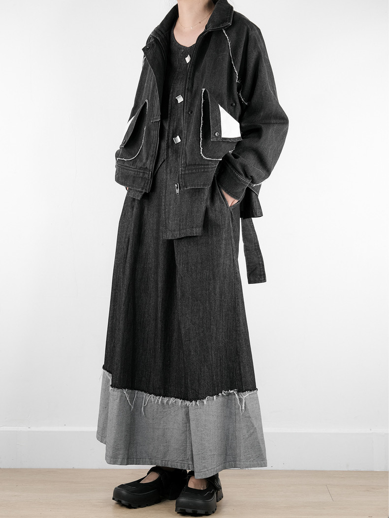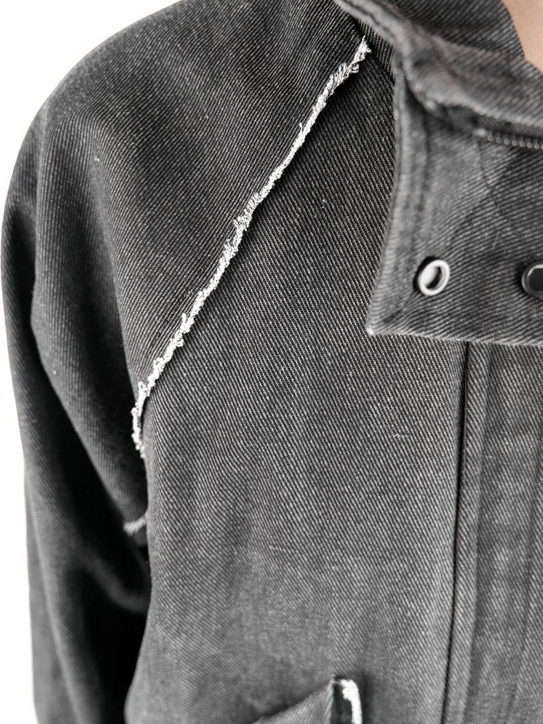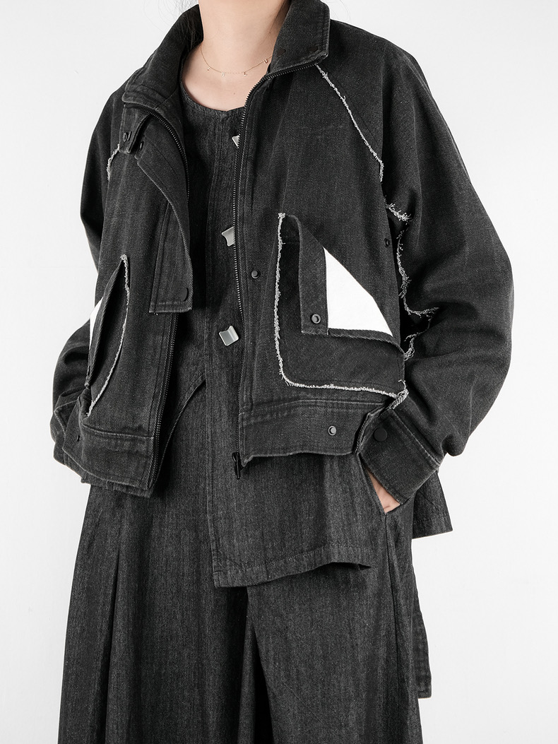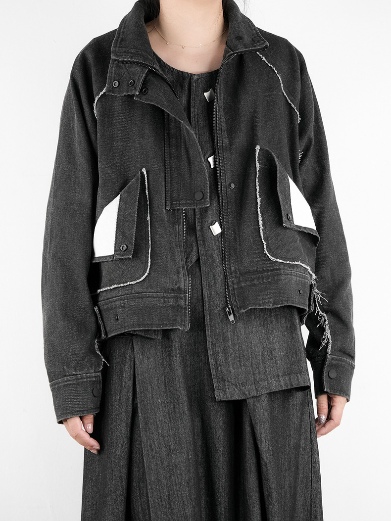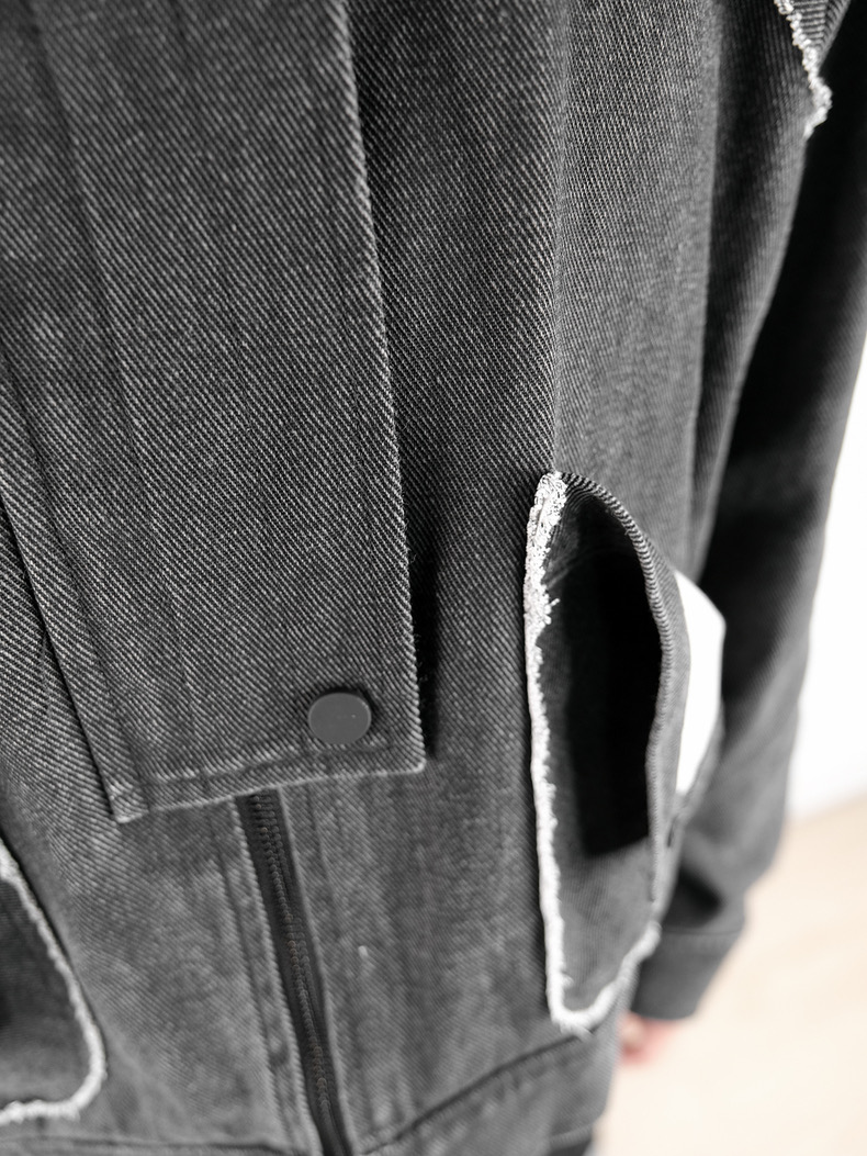ユニークなステッチとカットオフのディテールが目を引くデニムジャケットです。