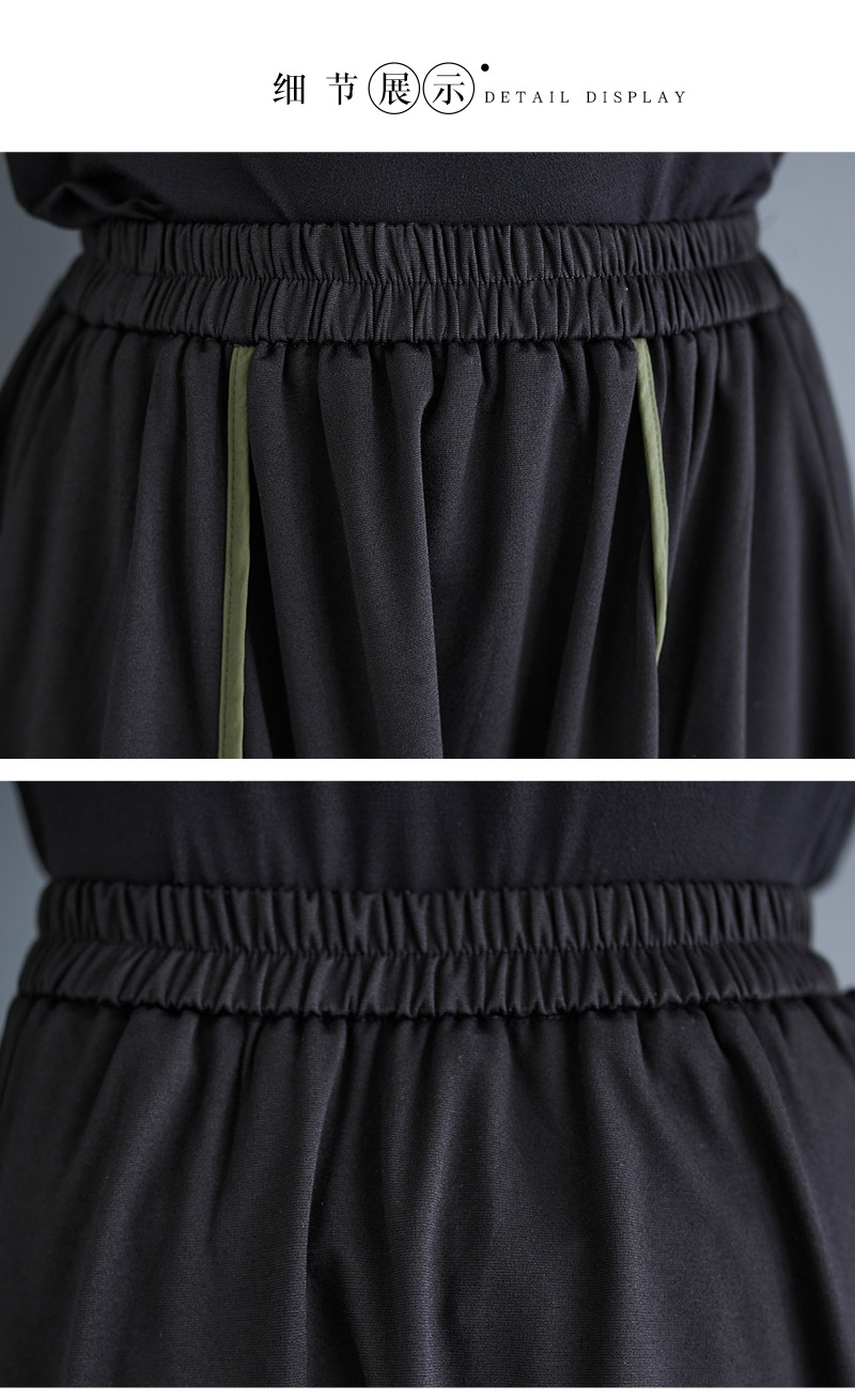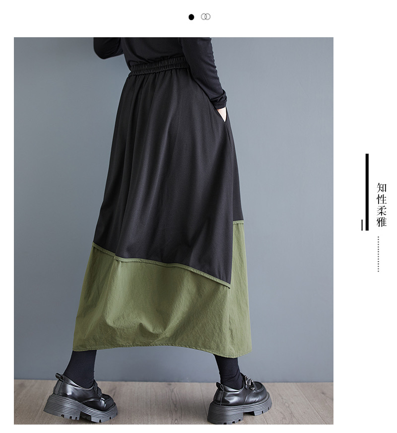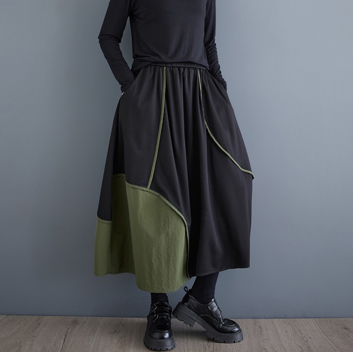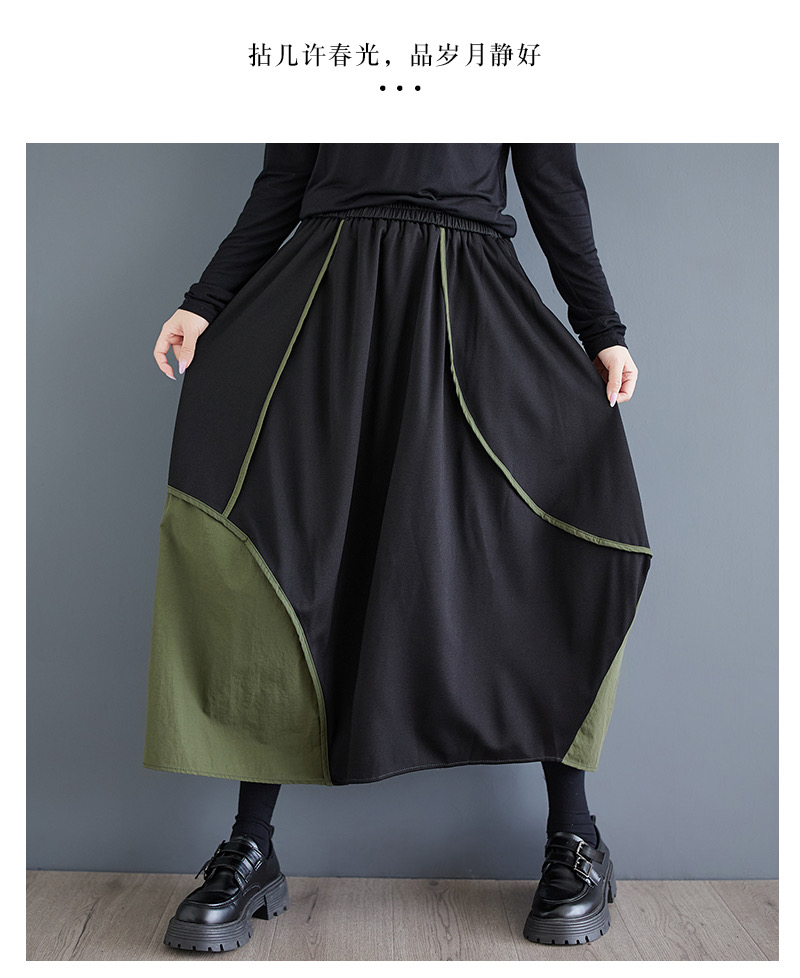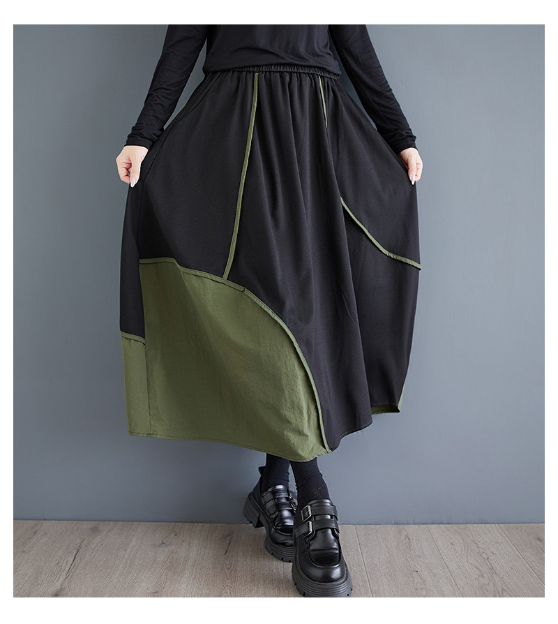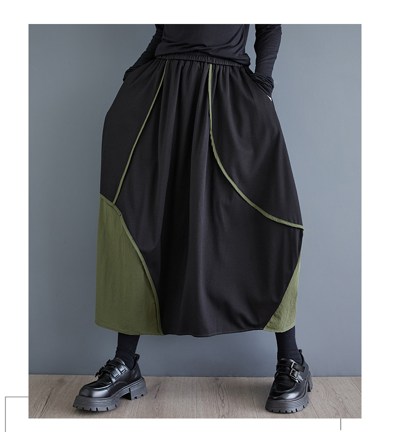 スタイリッシュで独特なデザインのAラインスカート。ブラックとカーキの配色が特徴で、シンプルながらも存在感があります。柔らかく軽量な素材を使用しており、動きやすく快適な着心地を提供します。ウエスト部分はゴム仕様で、サイズ調整が簡単。カジュアルからフォーマルまで幅広いスタイリングに対応します。