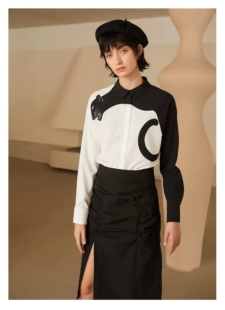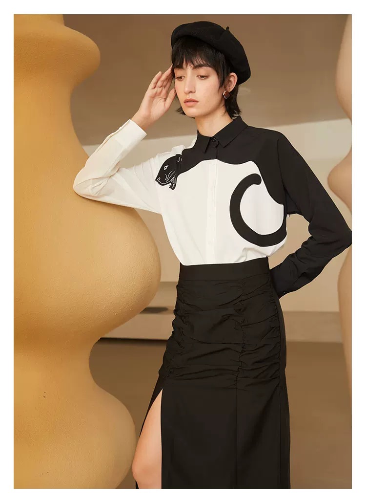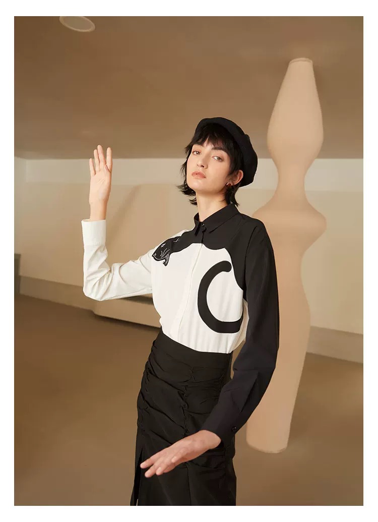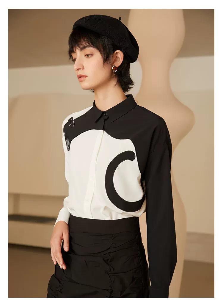 • 白と黒のバイカラーが特徴的なシャツで、シンプルながら個性を感じさせるデザイン。