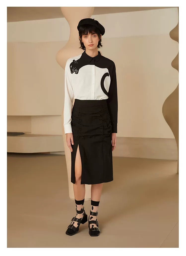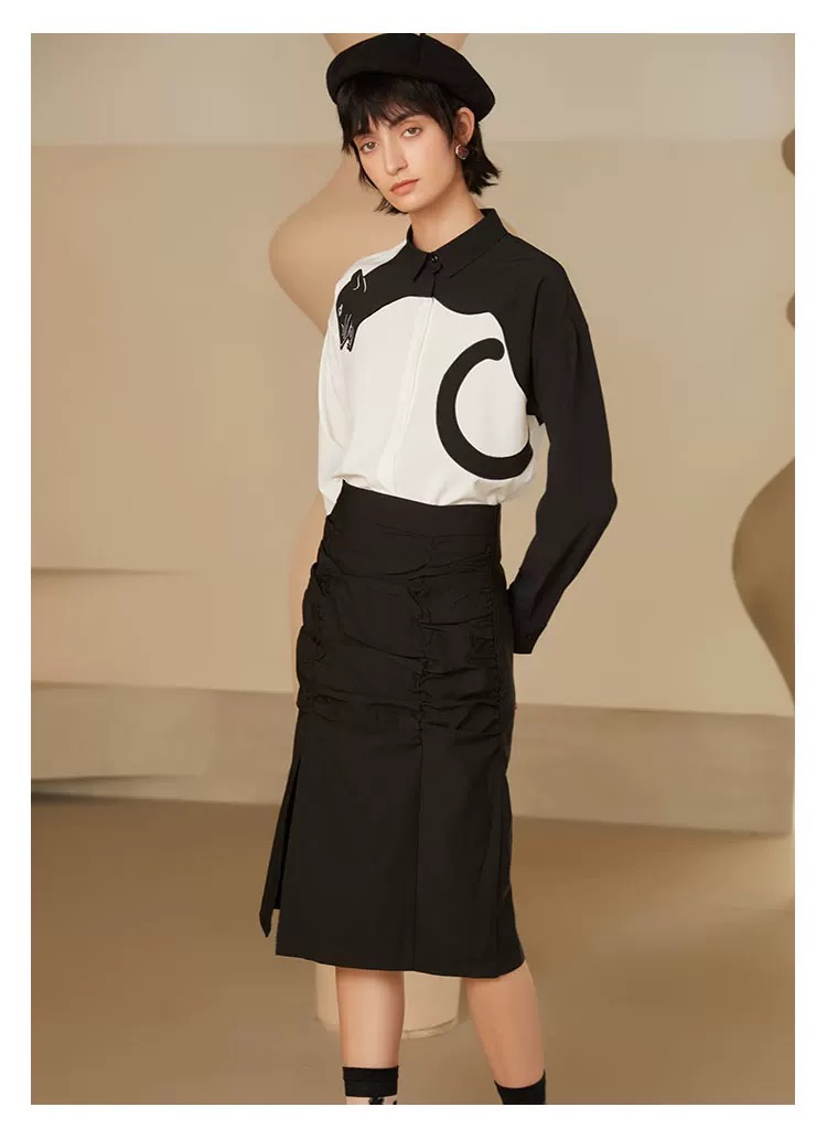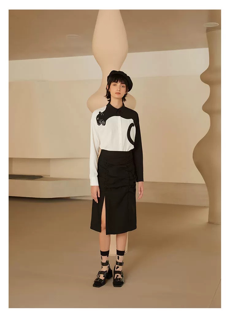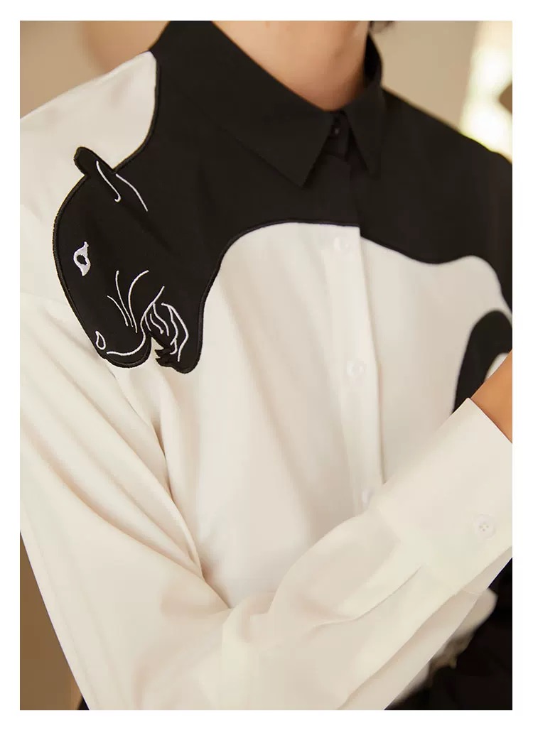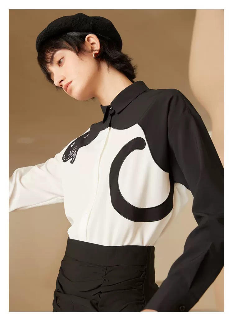 • 白と黒のバイカラーが特徴的なシャツで、シンプルながら個性を感じさせるデザイン。