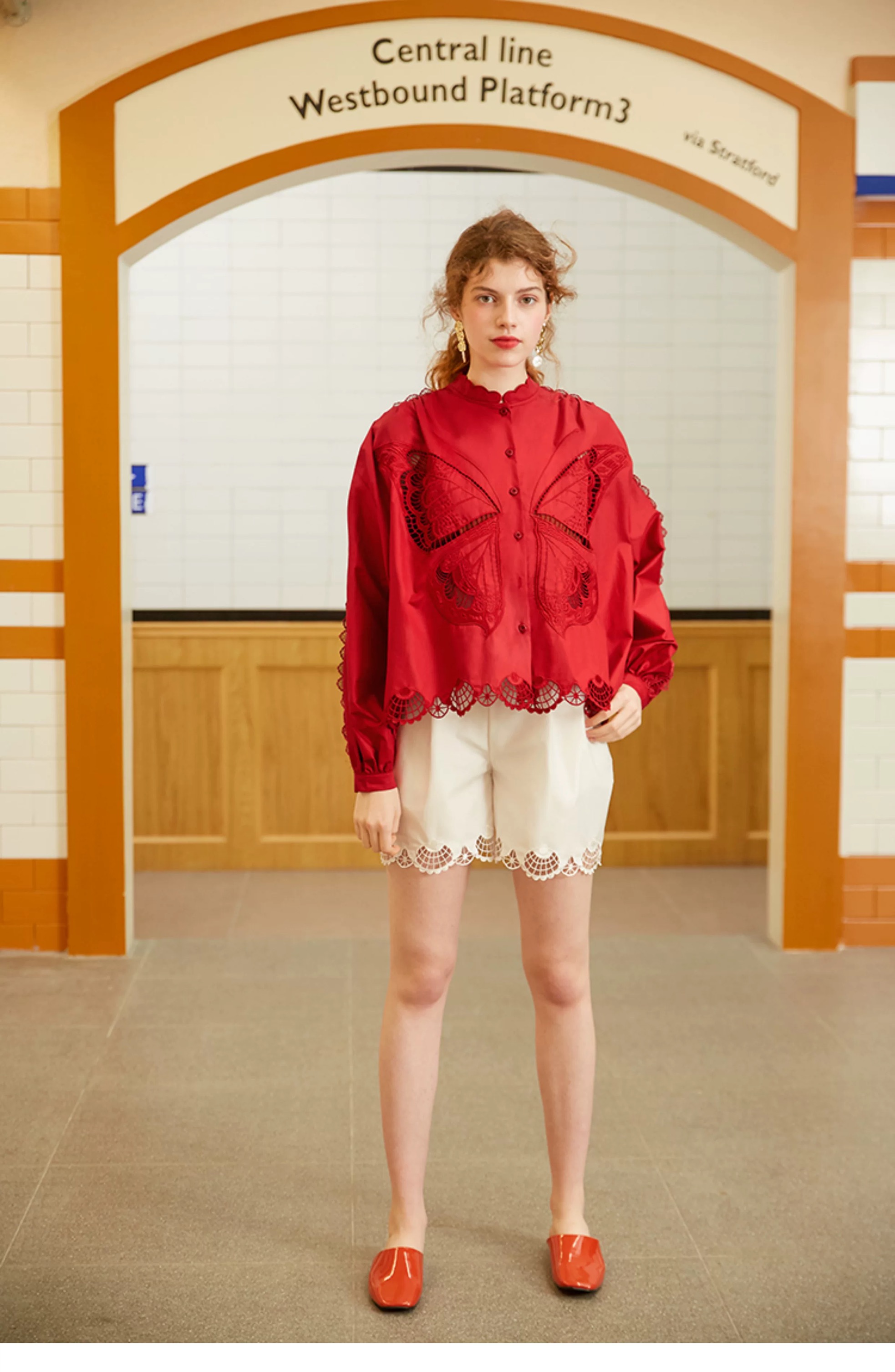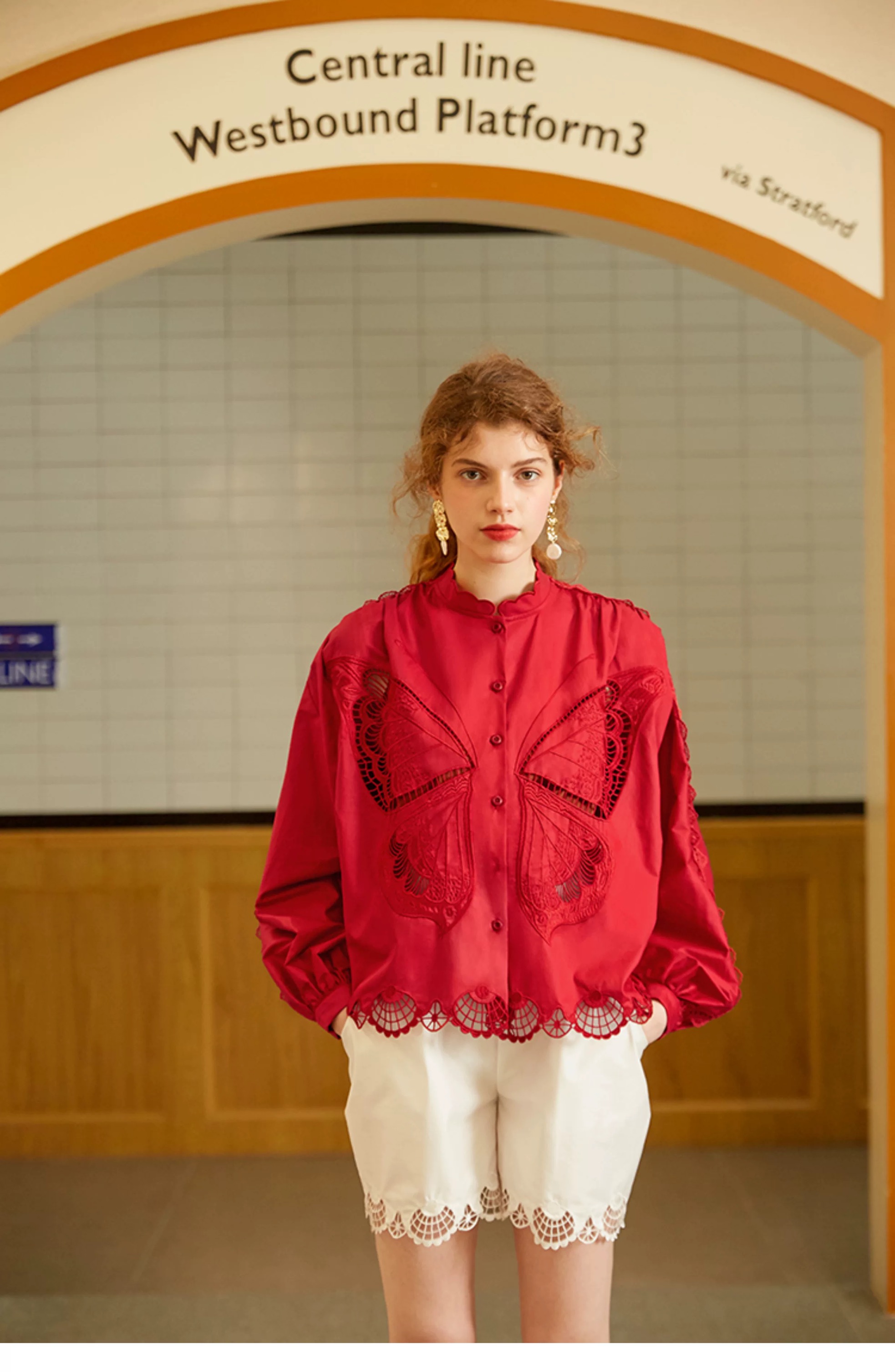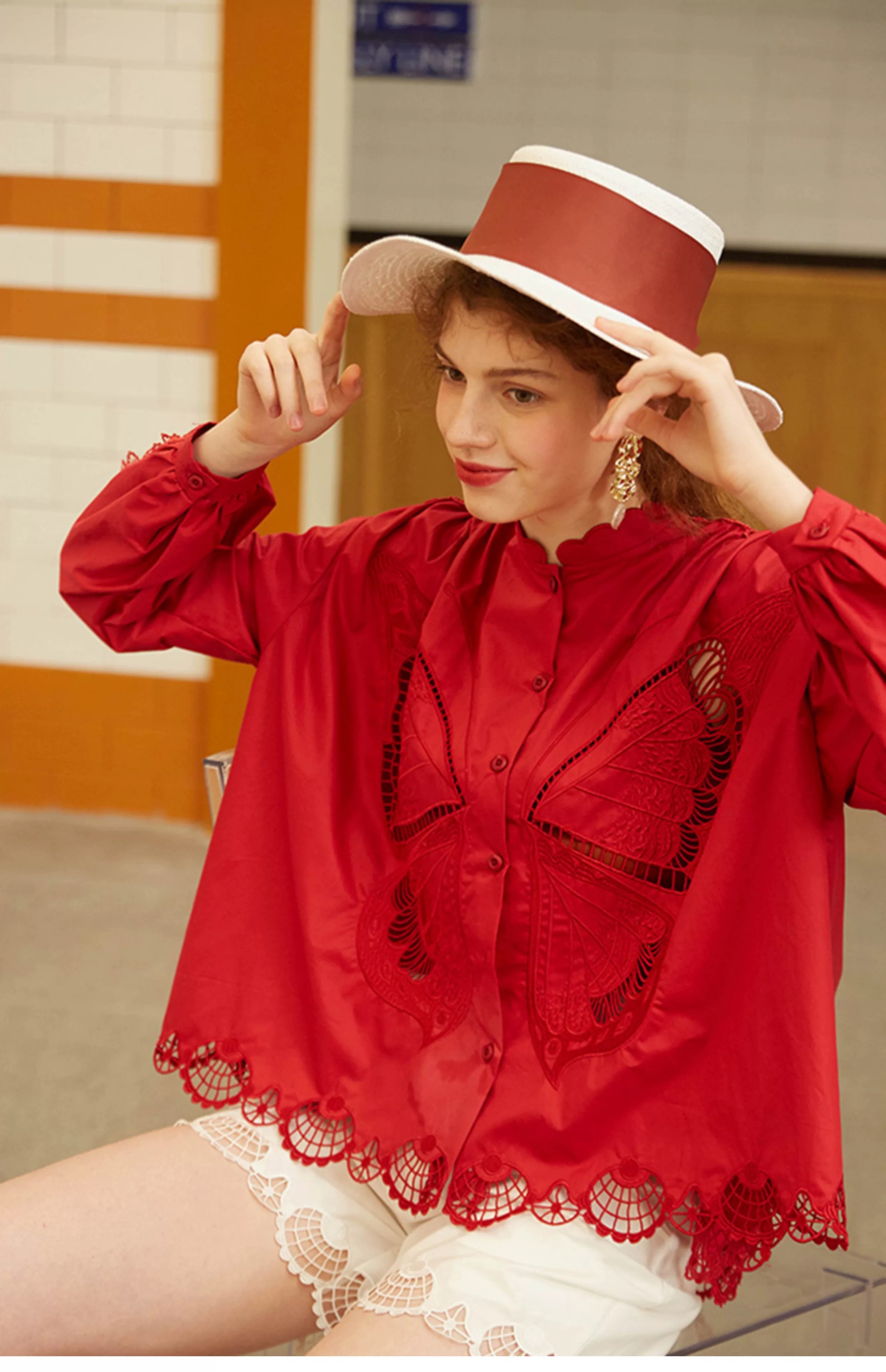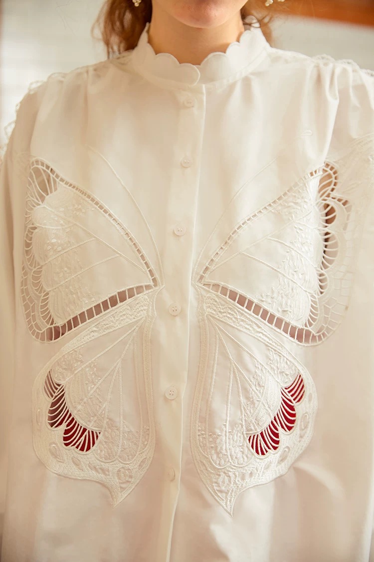 • 蝶の刺繍デザインが施された個性的なシャツ。