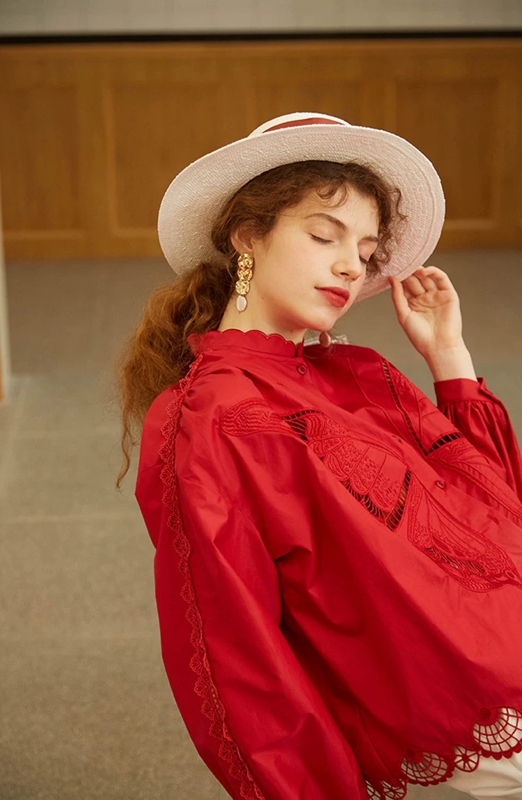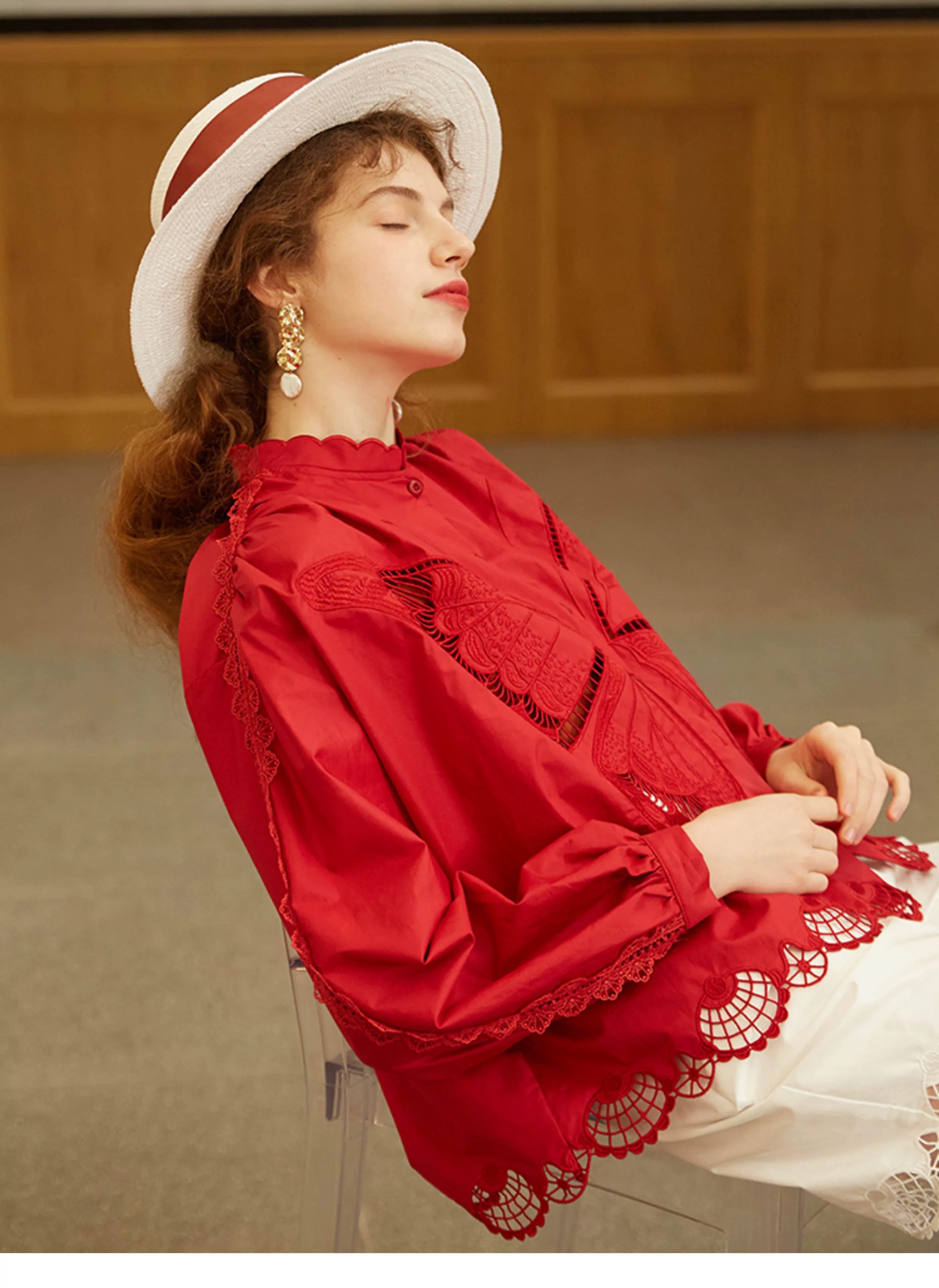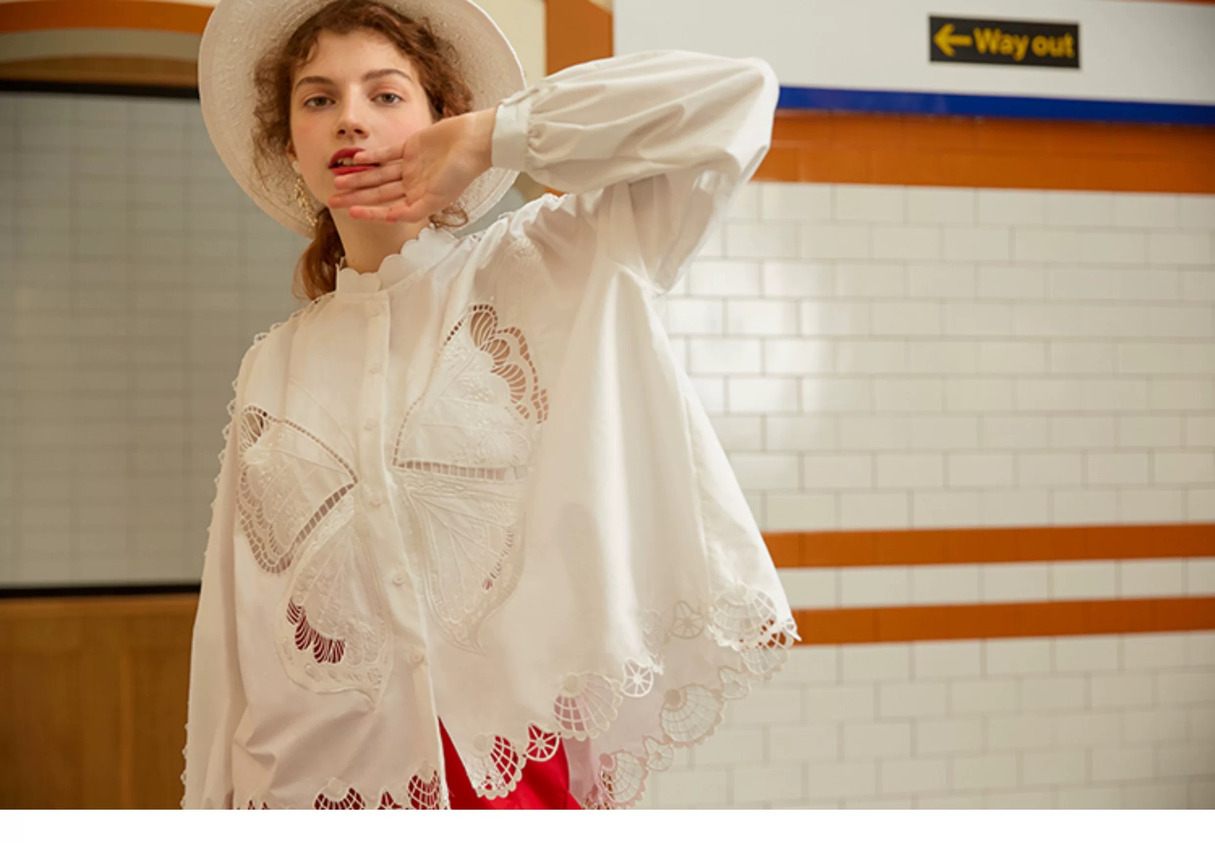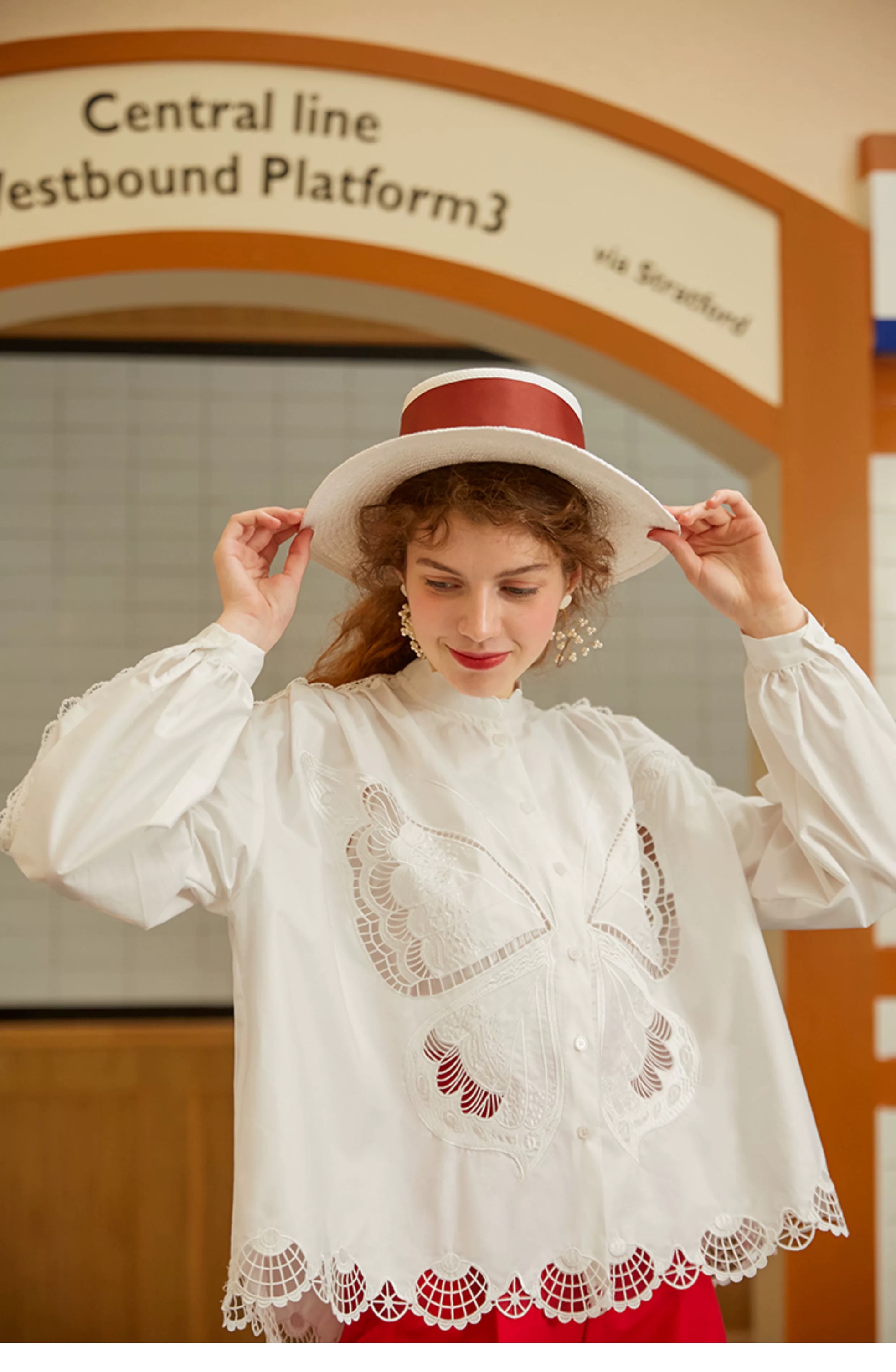 • 蝶の刺繍デザインが施された個性的なシャツ。