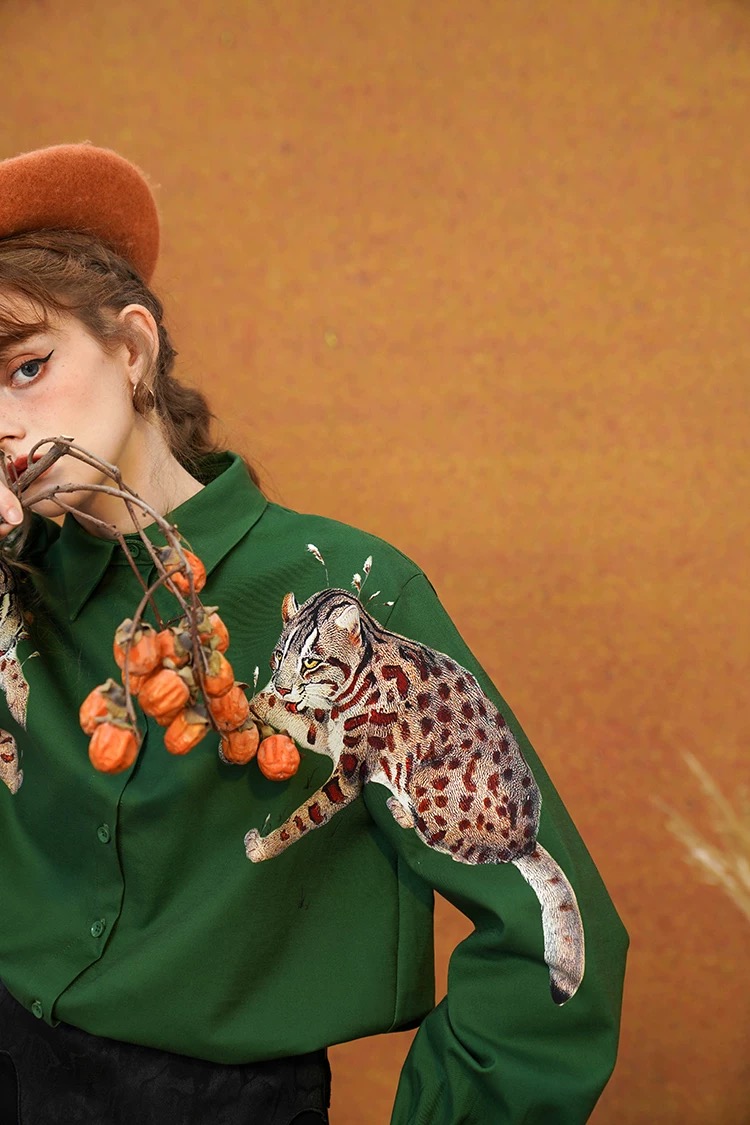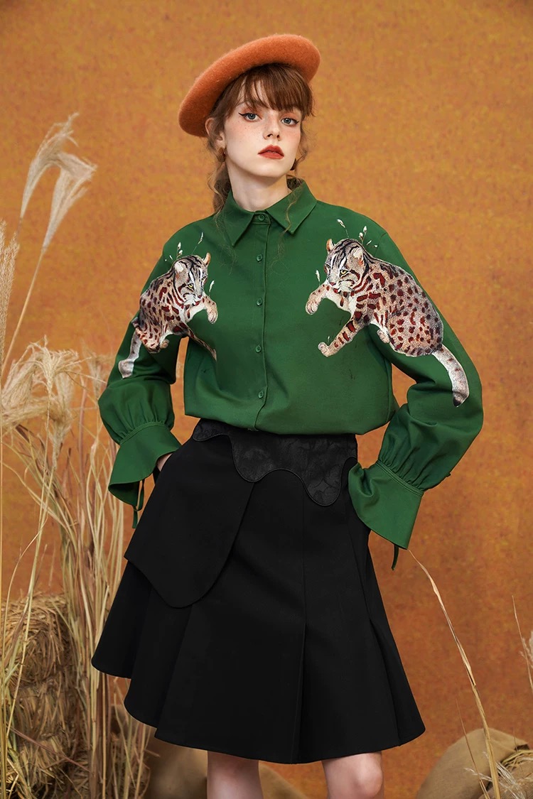 大胆なレオパード刺繍が目を引くデザインブラウス。深みのあるリーフグリーンが秋冬の季節感を演出します。袖口にはリボンディテールをあしらい、女性らしさをさりげなくアピール。シンプルながらも個性的なデザインで、日常使いから特別なシーンまで活躍する一着です。